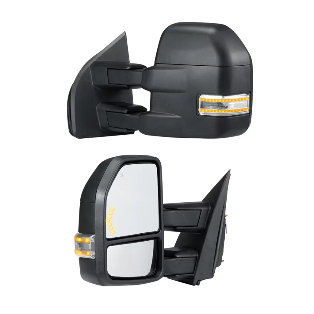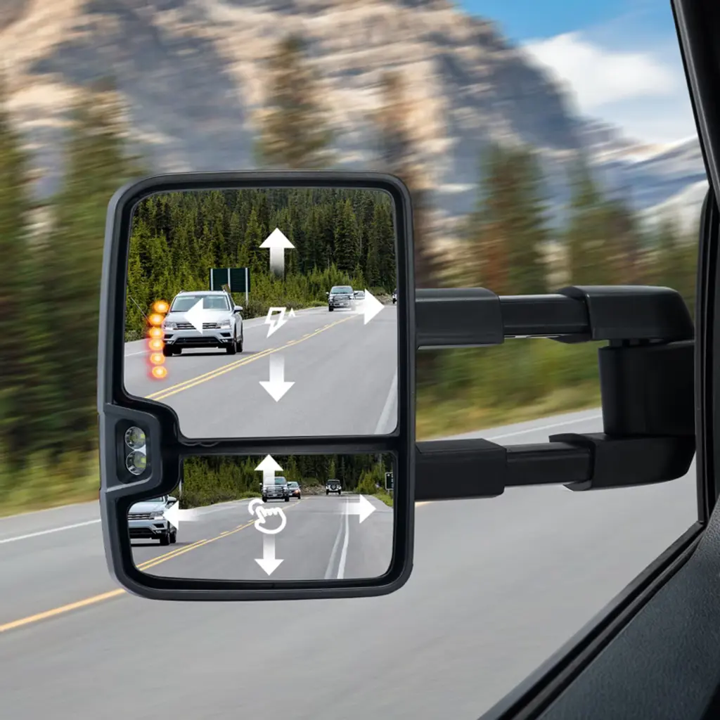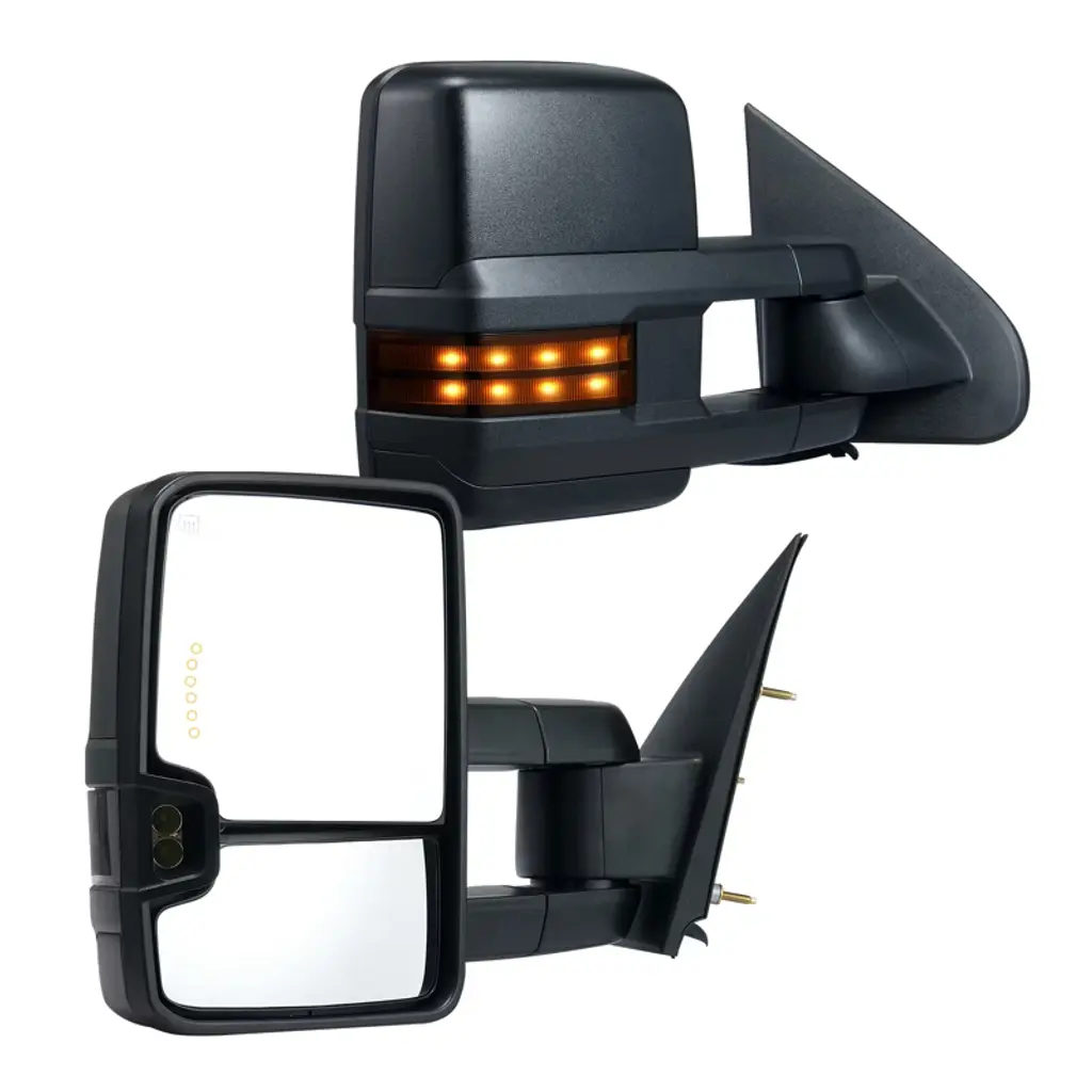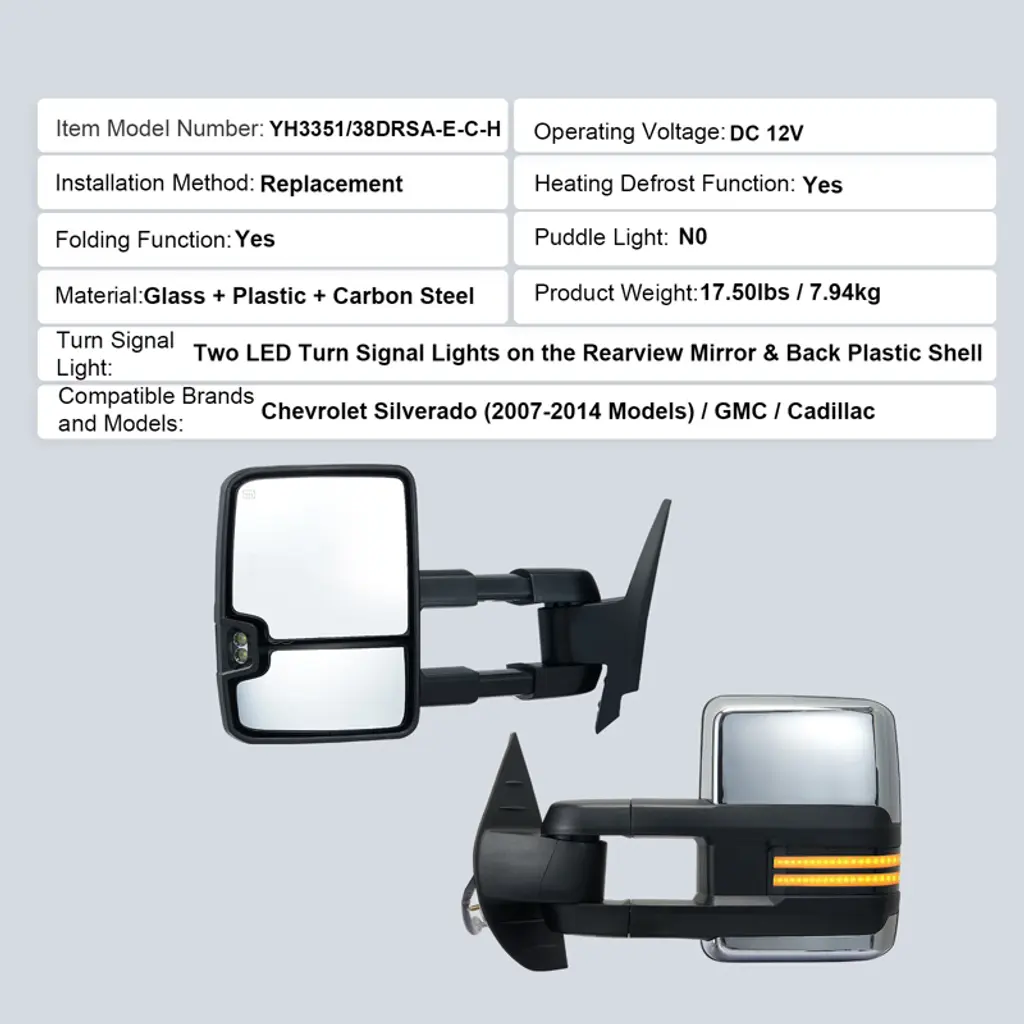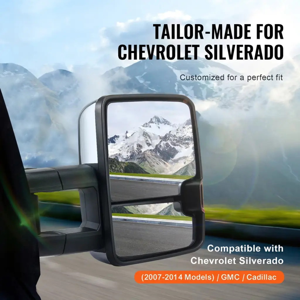 Feature: Vehicle Compatibility: Our towing mirrors are compatible with 2008-2013 For Chevy For Silverado/For GMC For Sierra all models; 2014 For Chevy For Silverado/For GMC For Sierra 2500HD 3500HD; 2007 For Chevy For Silverado/For GMC For Sierra Pickup new body style models; 2007-2013 For Chevy Tahoe Suburban Avalanche/For GMC Yukon Yukon XL Yukon Denali. No worries about mismatched parts here – our mirror set is designed to blend seamlessly with your vehicle, ensuring a snug fit. Four-Way Adjustment: With advanced multidimensional adjustment and electric adjustment features, you can tweak the tow mirrors to just the right angle for your driving style. Whether it's vertical or horizontal adjustment, precise control is achievable. No more blind spots ruining your day – get ready for a safer, smoother ride. Diverse Lighting Configuration: Light up the road with our trailer mirrors' turn signal lights. They boost visibility in dim conditions and add a touch of sleekness to your vehicle. Crafted from industrial-grade plastic and carbon steel, they're built to last through countless adventures. Folding and Heating Functions: These truck mirrors are designed with manual telescopic folding functionality, making storage a breeze and facilitating passage through narrow spaces. The heating function ensures quick removal of frost or fog for crystal-clear vision, even on rainy and snowy days. Easy Installation: No need to call in the pros or hunt down special tools – installing our trailer towing mirror is as easy as pie! Just hook it up to your vehicle's power supply (DC 12V), and you're good to go. We've included everything you need in the package, along with a step-by-step guide that even a DIY newbie can follow. Package Content 2 x Towing Mirrors 4 x Connection Cables (2.5 m) 1 x Accessories Kit 1 x User Manual
