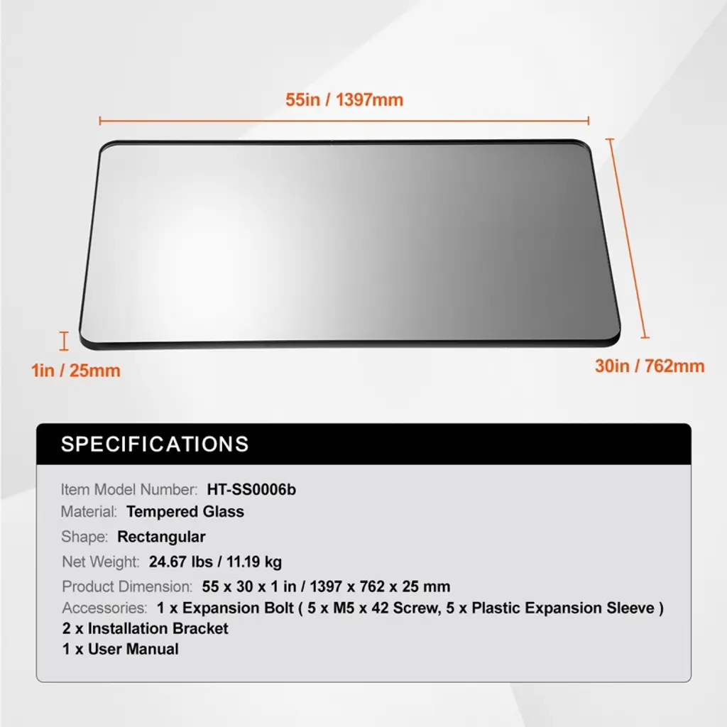 Feature: Epoxy Coating for Clear Reflections: This mirror offers bright and flawless reflections with detailed imaging. Its corrosion-resistant epoxy coating keeps the surface fresh and accurate, capturing every moment with clarity. Tempered Glass with Shatter-Resistance: The 0.15"" tempered glass, paired with a shatter-resistant film, enhances durability. It reduces the risk of fragments scattering upon impact, making cleanup easier and minimizing hazards compared to regular glass. Brushed Aluminum Frame is Moisture & Scratch-Resistant: Designed with brushed aluminum alloy, the frame is lightweight, corrosion-resistant, and scratch-proof. It stays rust-free, delivering long-lasting performance and maintaining a sleek, modern appearance. Flexible Installation for Any Room: This mirror can be easily mounted in bathrooms, hallways, living rooms, or bedrooms, blending seamlessly with various interior styles. Its adaptable design allows it to fit comfortably into different layouts. Z-Shaped Wall Bracket for Easy Installation: The Z-shaped bracket offers simple installation with a sturdy structure. It requires no complex steps and safeguards walls from damage, ensuring your space is efficiently utilized and visually pleasing. Package Content 1 x Mirror 1 x Expansion Bolt(5 x M5 x 42 Screw, 5 x Plastic Expansion Sleeve) 2 x Installation Bracket 1 x User Manual