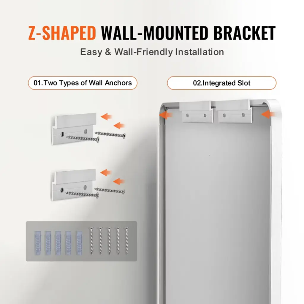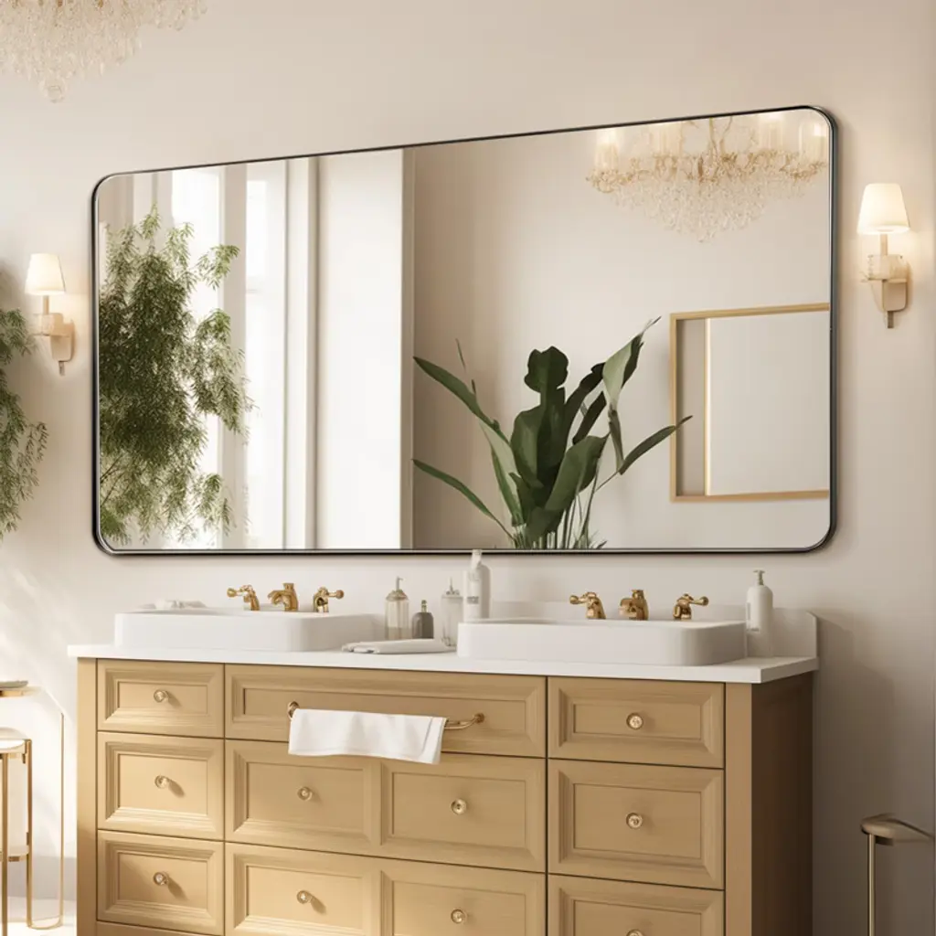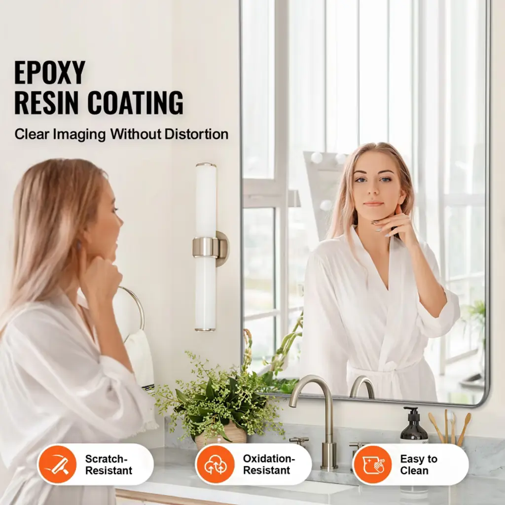 Feature: Epoxy Coating for Clear Reflections: This mirror offers bright and flawless reflections with detailed imaging. Its corrosion-resistant epoxy coating keeps the surface fresh and accurate, capturing every moment with clarity. Tempered Glass with Shatter-Resistance: The 0.15" tempered glass, paired with a shatter-resistant film, enhances durability. It reduces the risk of fragments scattering upon impact, making cleanup easier and minimizing hazards compared to regular glass. Brushed Aluminum Frame is Moisture & Scratch-Resistant: Designed with brushed aluminum alloy, the frame is lightweight, corrosion-resistant, and scratch-proof. It stays rust-free, delivering long-lasting performance and maintaining a sleek, modern appearance. Flexible Installation for Any Room: This mirror can be easily mounted in bathrooms, hallways, living rooms, or bedrooms, blending seamlessly with various interior styles. Its adaptable design allows it to fit comfortably into different layouts. Z-Shaped Wall Bracket for Easy Installation: The Z-shaped bracket offers simple installation with a sturdy structure. It requires no complex steps and safeguards walls from damage, ensuring your space is efficiently utilized and visually pleasing. Package Content: 1 x Mirror 1 x Expansion Bolt(5 x M5 x 42 Screw, 5 x Plastic Expansion Sleeve) 2 x Installation Bracket 1 x User Manual
