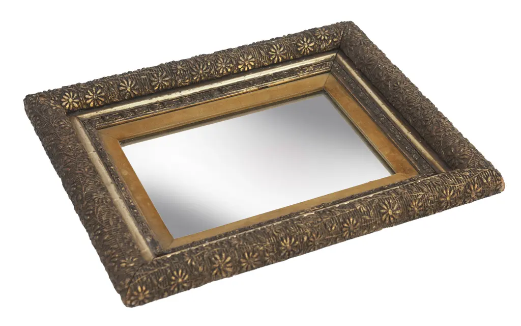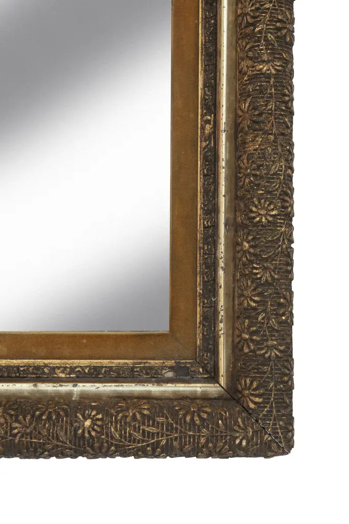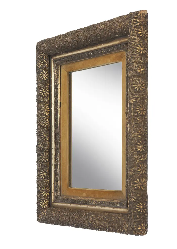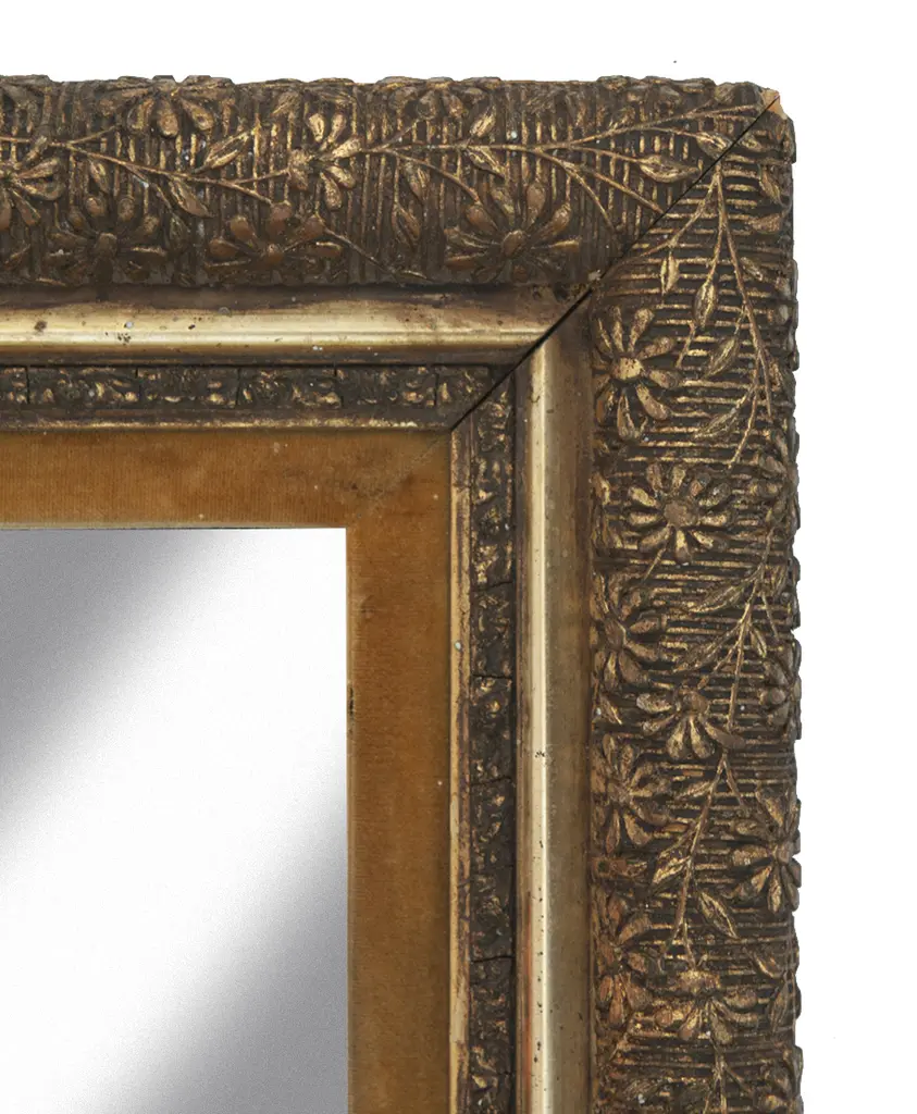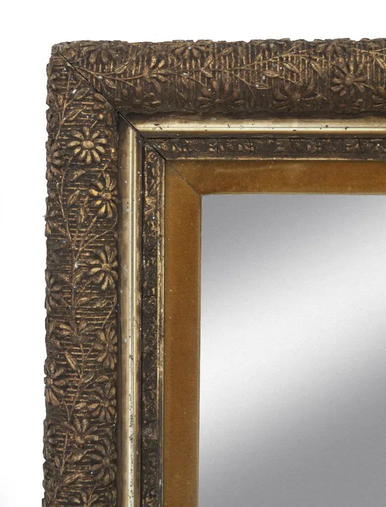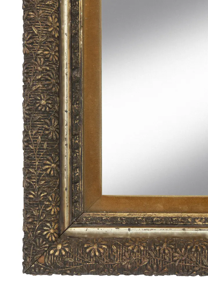Unique Victorian gold mirror with velvet & gilt inserts. The unique daisy floral pattern decorates the frame, which is in very good condition for its age.