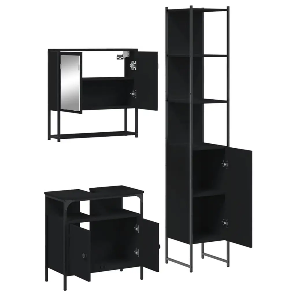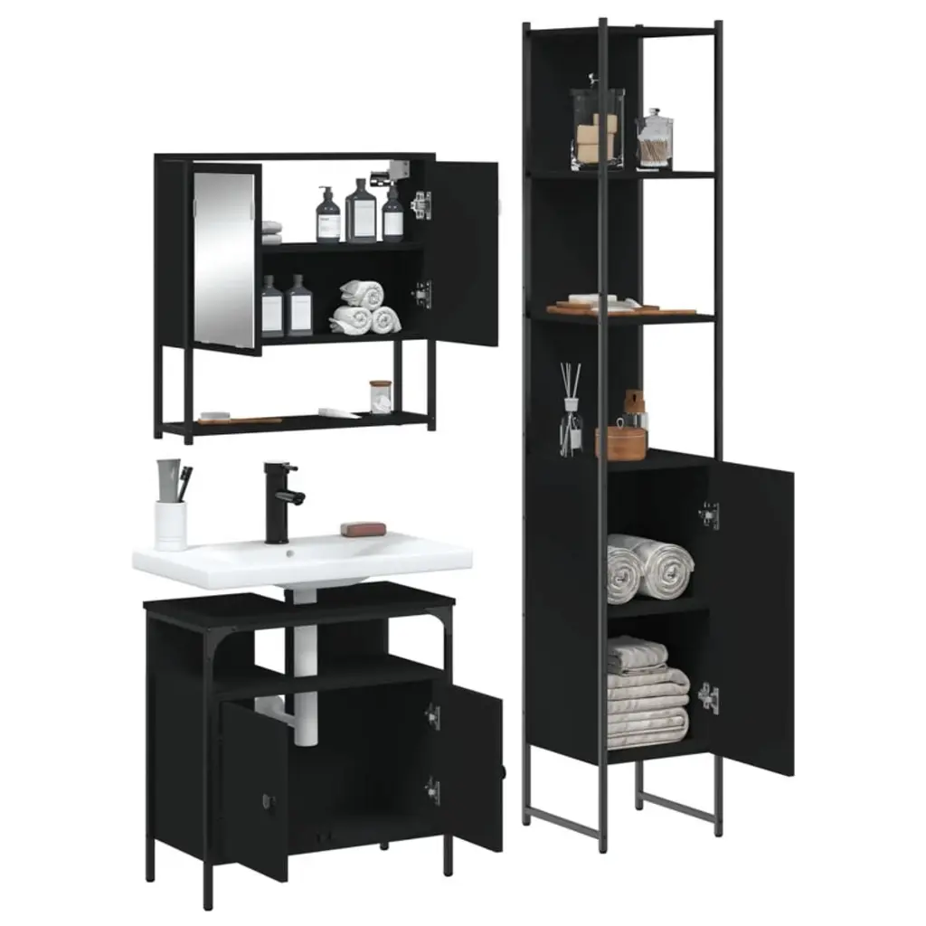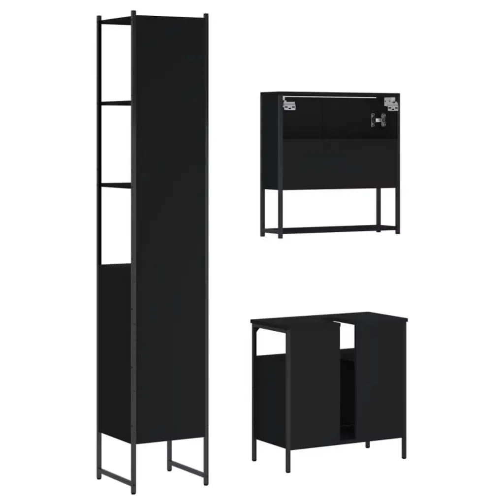 Vidaxl 3-piece Bathroom Furniture Set - Black Engineered Wood With Mirror Cabinet, Sink Cabinet, And Tall Cabinet - Modern Storage Solutions For Home