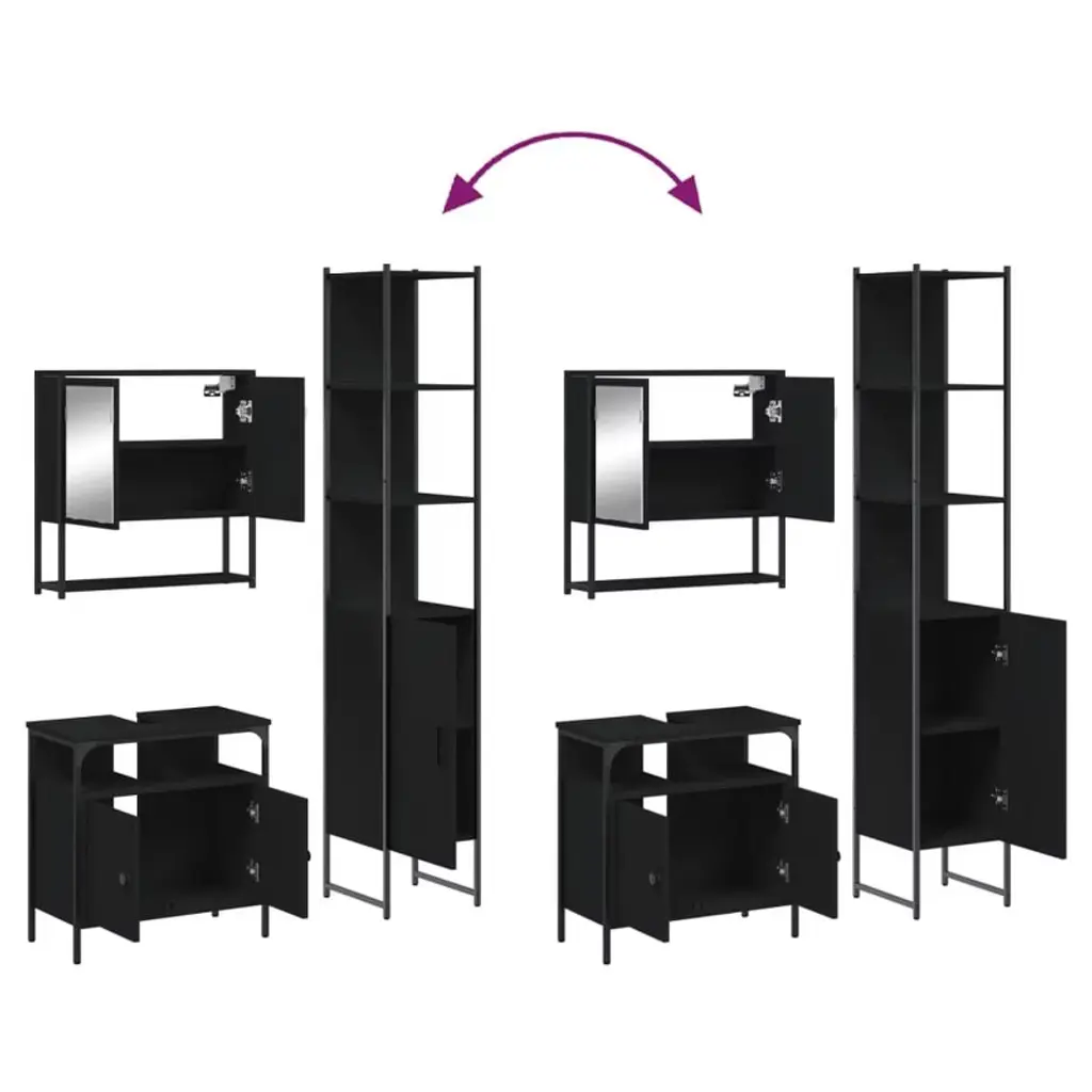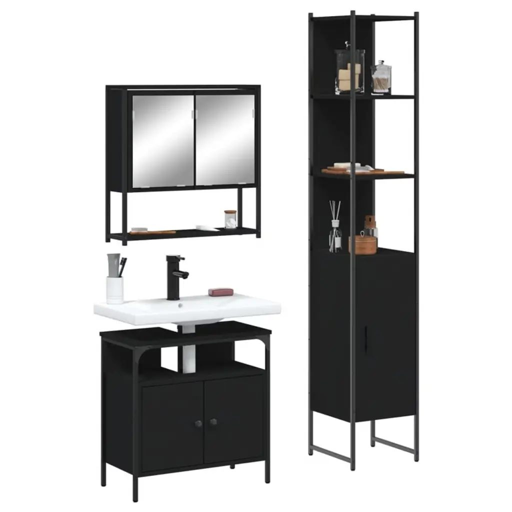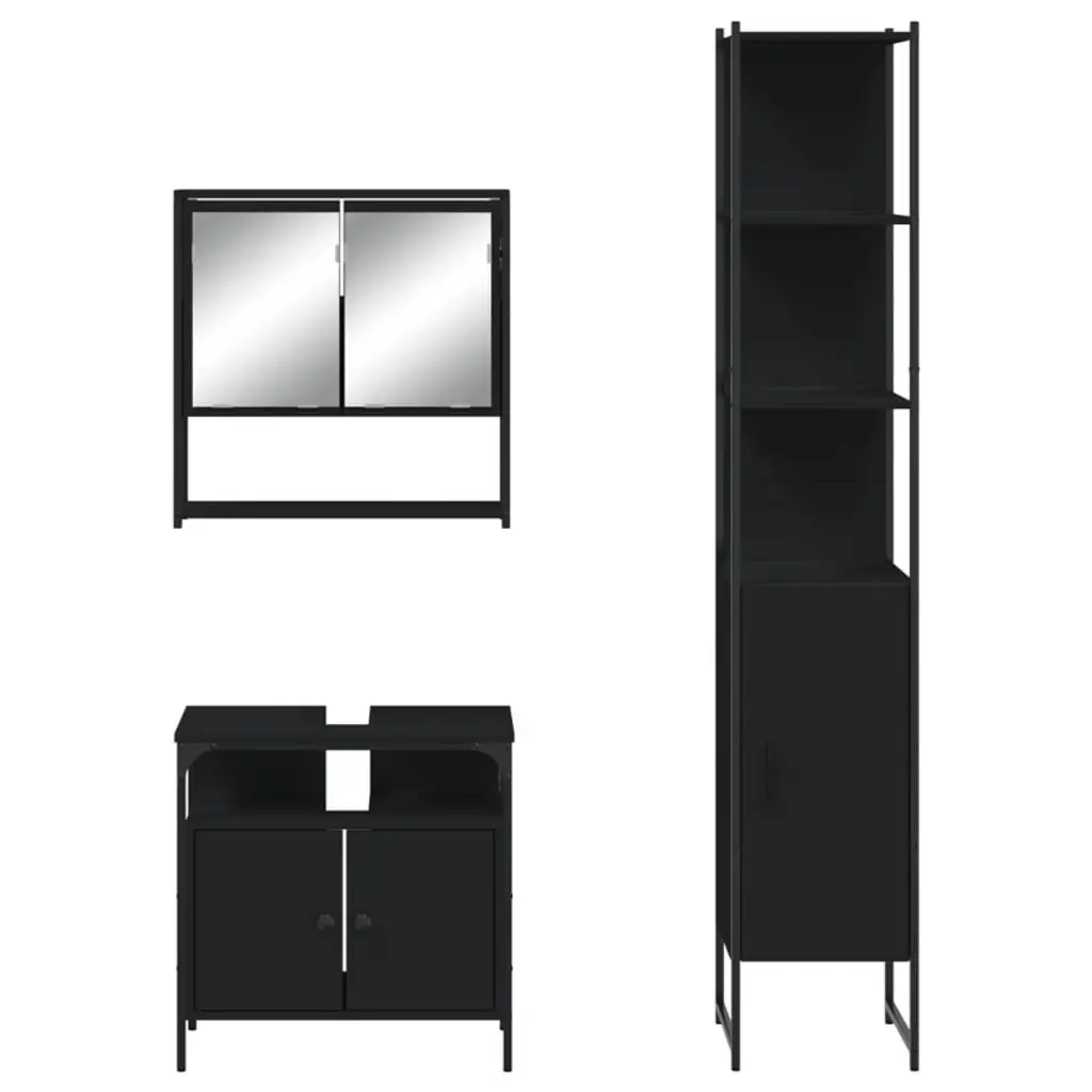 This Modern 3-Piece Bathroom Furniture Set blends style and functionality perfectly, making it great for today's bathrooms. It includes a bathroom mirror cabinet, sink cabinet, and storage cabinet, giving you plenty of space for all your grooming stuff, while the sleek black finish makes it a striking addition to any home.Specifications:Color: Black Shape: RectangularMaterial: Engineered woodFinish: Powder-Coated Indoor/Outdoor: Indoor OnlyNumber of Doors: 4Cover Included: NoRoom: BathroomHeadboard Included: NoMounting Included: Wall / ceiling fixtures - eg specific screws or wall plugs - not includedDimensions: 11.8 x 23.6 x 23.6 in (W x L x H)Swings: NoLadder: NoBrand: vidaXLDelivery Contains: 1 x Bathroom mirror cabinet, 1 x Bathroom sink cabinet, 1 x Bathroom cabinetAssembly Required: YesRecommended Number of People for Assembly: 2SKU: 3214675EAN: 8721012403376