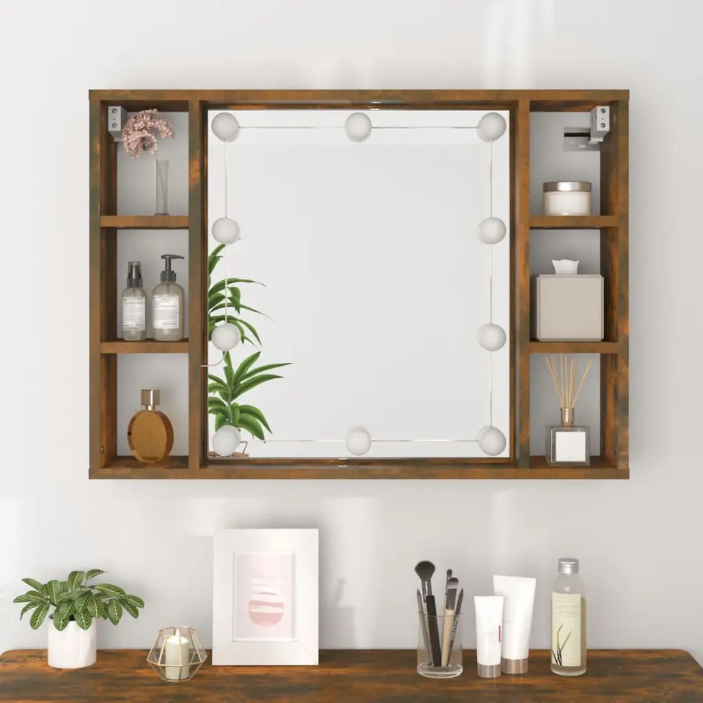 This sleek and sophisticated mirror cabinet combines functionality and modern style, perfect for any indoor setting like bathrooms or bedrooms. The elegant smoked oak finish complements contemporary decor while offering essential features for makeup and jewelry storage. LED Lighting: Integrated LED lights ensure perfect visibility while grooming or doing makeup, letting you enjoy a brighter and clearer reflection any time of day. Whether preparing for a night out or simply touching up your look, the lighting elevates your personal grooming experience.Ample Storage: With six spacious shelves, this cabinet provides abundant space for organizing and storing cosmetics and jewelry. The wall-mounted design keeps your essentials neatly arranged and easily accessible, enhancing your daily routine.Durable Material: Constructed from quality engineered wood, this mirror cabinet boasts a water-resistant finish, making it ideal for bathrooms. You can rely on this piece for durability and longevity, ensuring it remains a staple in your home for years to come.Modern Aesthetic: Featuring a sleek matte finish, the cabinet delivers a contemporary look that seamlessly integrates into various interior design styles. Its minimalist silhouette makes it a timeless addition that enhances your living space without overpowering it.Easy Installation: This wall-mounted cabinet simplifies your setup, requiring only basic tools for assembly. With its straightforward installation process, you can quickly elevate your space, creating an organized and stylish environment. The product comes with a USB connector, but you won't find the certified 5V USB power source in the box.