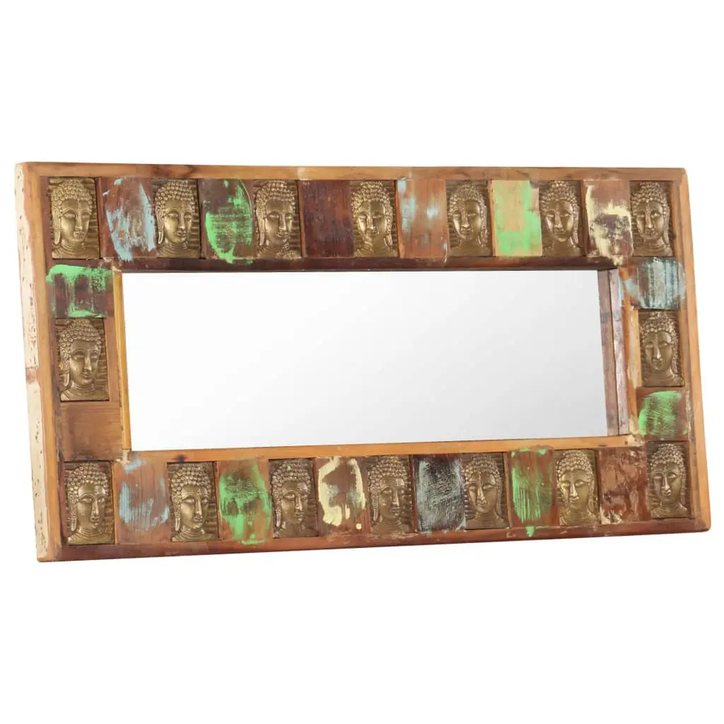 This Retro Buddha Cladding Wooden Mirror is a superb piece that combines practical use with a touch of art. Made from solid reclaimed wood, it displays a stunning Buddha design on its surface, which adds elegance and a calming feel to your home. Handmade Craftsmanship: Each mirror showcases careful craftsmanship, meaning no two pieces are the same. Its handmade quality gives it a unique charm.Elegant Design: The Buddha cladding is a standout feature, making this mirror a stylish addition that enhances any room's look while reflecting light beautifully.Spacious Reflection: At 43.3 x 19.7 in, the mirror provides a wide view, perfect for getting ready or a quick look while passing through.Versatile Use: Made for indoor spaces, this mirror fits perfectly in bedrooms, hallways, or bathrooms, adapting smoothly to different decor styles.Weathered Finish: The rustic texture from the weathered wood adds depth and charm, making it a perfect fit for vintage or retro-themed interiors.