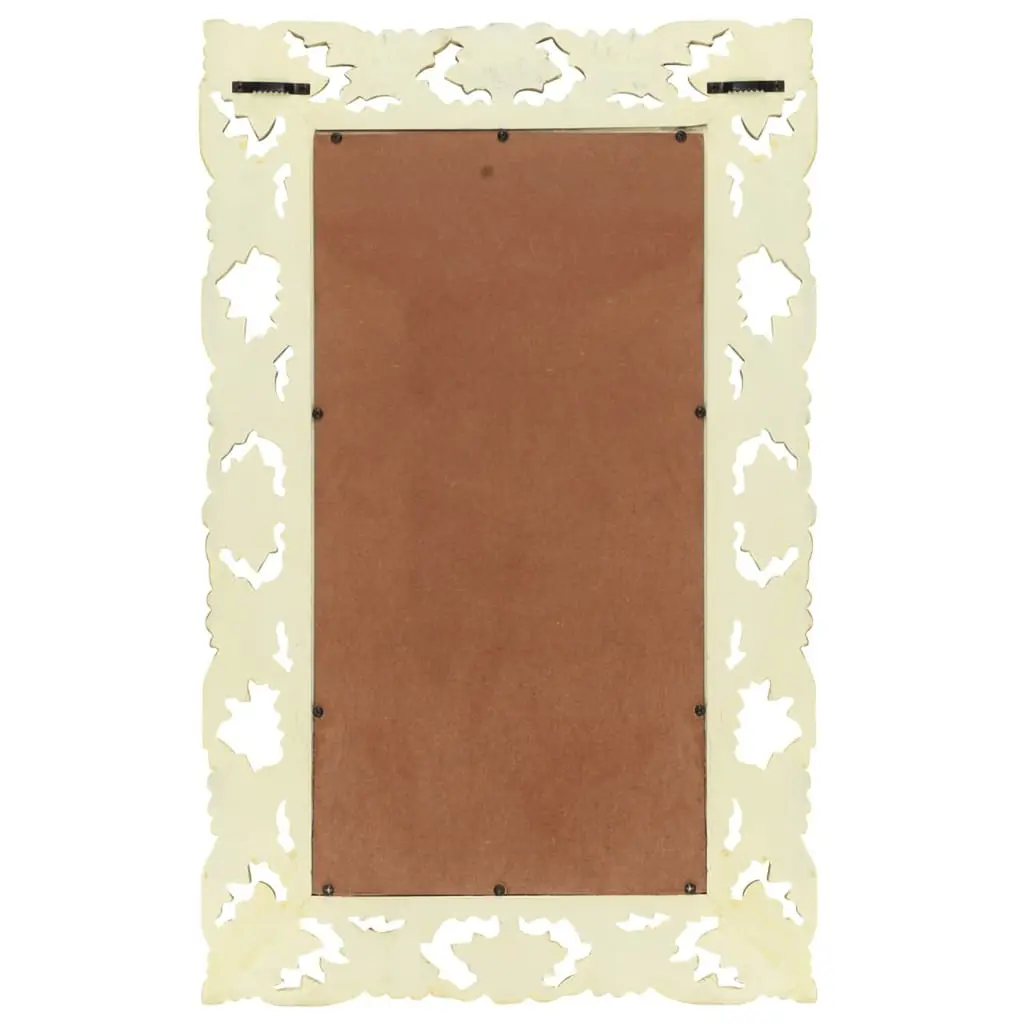 This hand-carved wooden mirror is a fab addition to any room, featuring a smooth white finish that screams elegance. The unique craftsmanship in the mango wood blends art and practicality, making it a stunning focal point for your bathroom, living room, or hallway. Hand-Carved Detailing: Each mirror boasts unique hand-carved patterns, ensuring no two are alike, giving a personal touch to your decor. The craftsmanship shows off artisan skills while bringing charm to your space.Solid Mango Wood Construction: Made from solid mango wood for durability and eco-friendliness, this sturdy frame withstands the test of time, adding to the piece's overall quality.Versatile Application: Perfect as a vanity mirror in your grooming routine or as a decorative wall piece, this mirror adds style and function to any room.Smooth Finish: The natural wood finish highlights the mango wood's unique texture and prevents fading, keeping it looking great in different lighting.Perfect Dimensions: Measuring 19.7 in wide and 31.5 in long, with a narrow thickness of 1.0 in, this medium-sized mirror fits well while making a statement.
