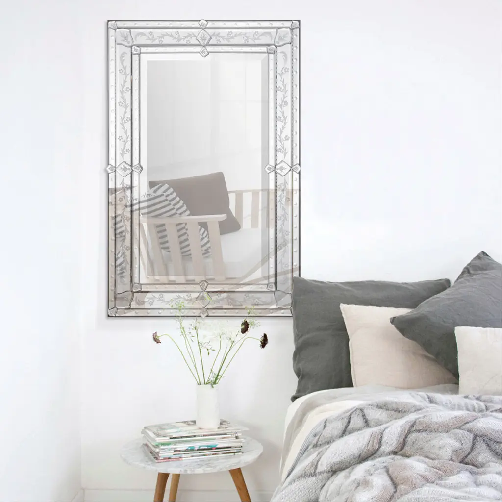 This elegant Venetian mirror features a classic etched pattern frame. Mirror is beveled.