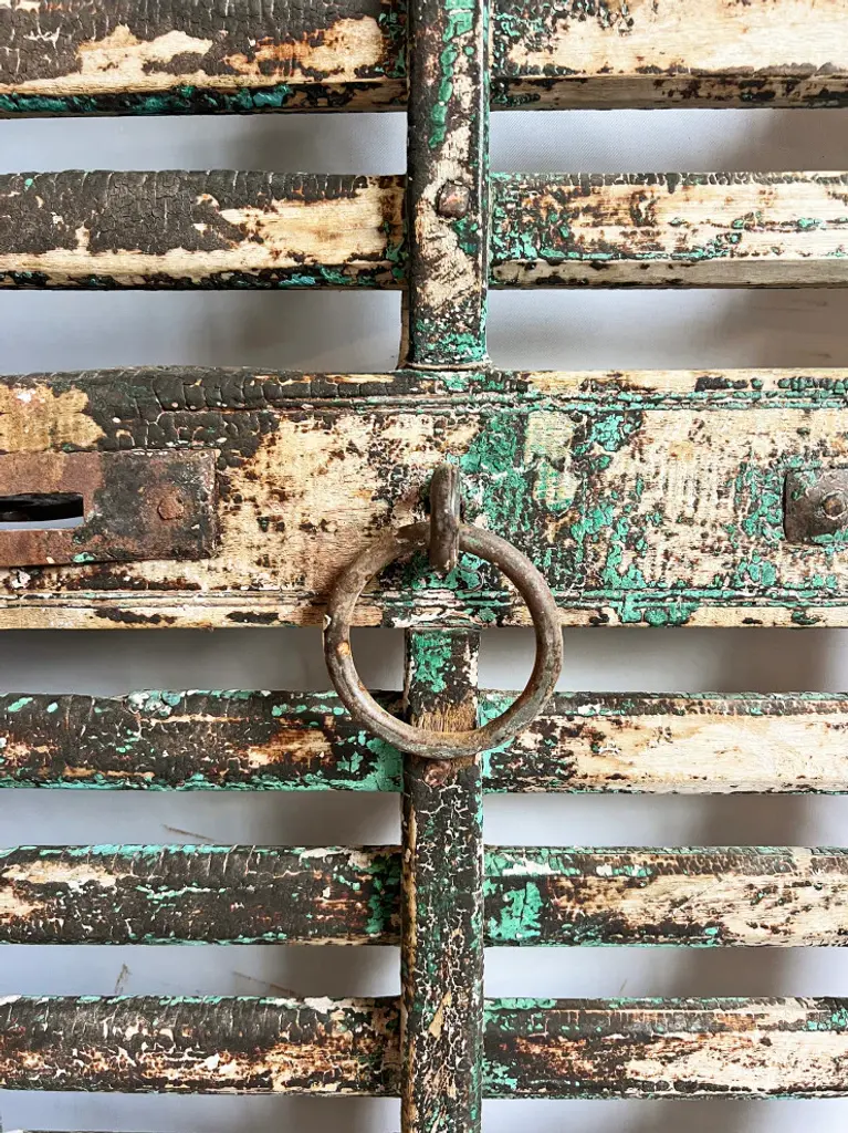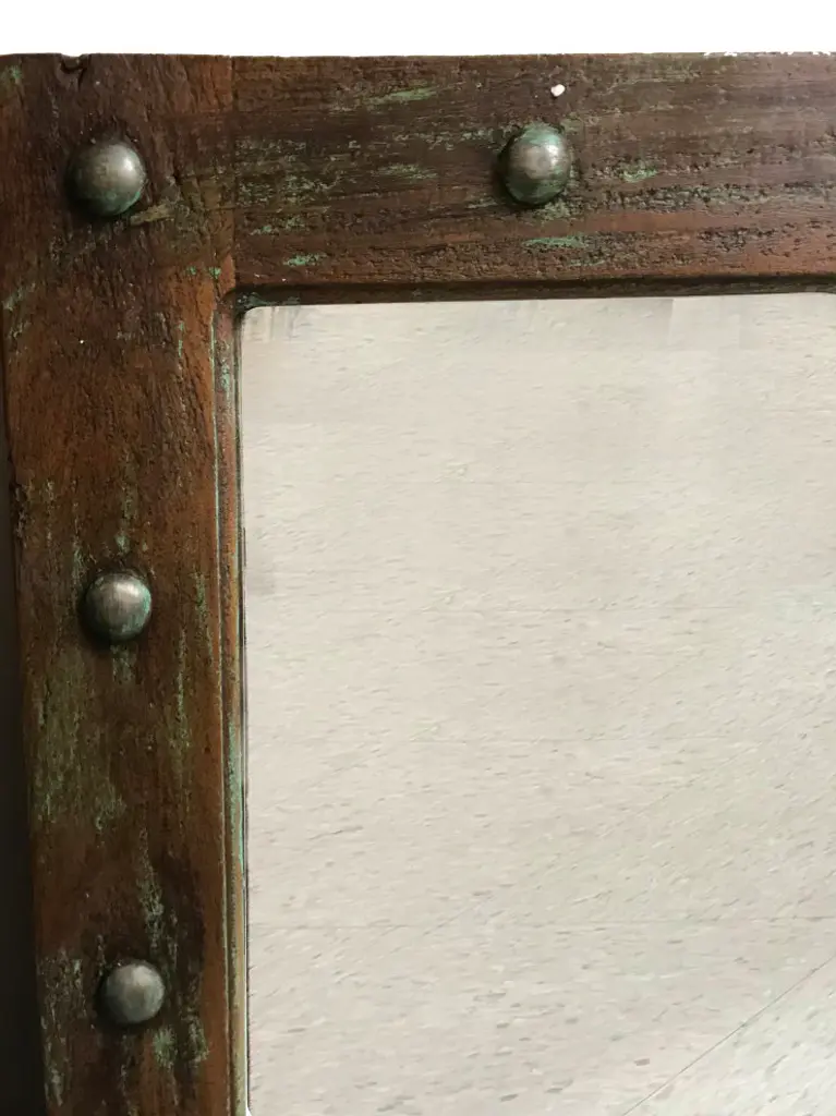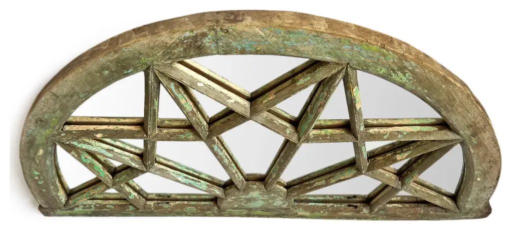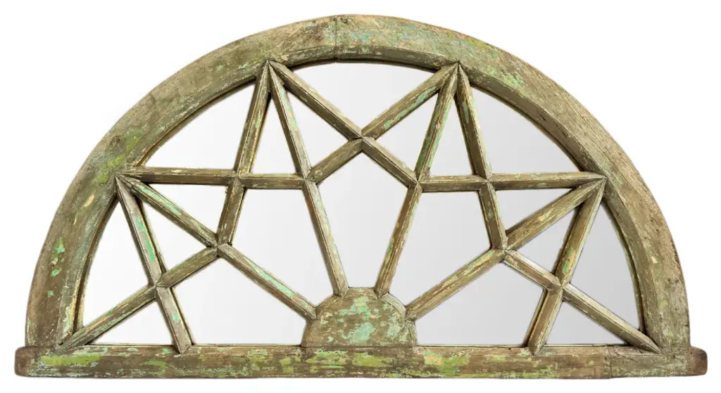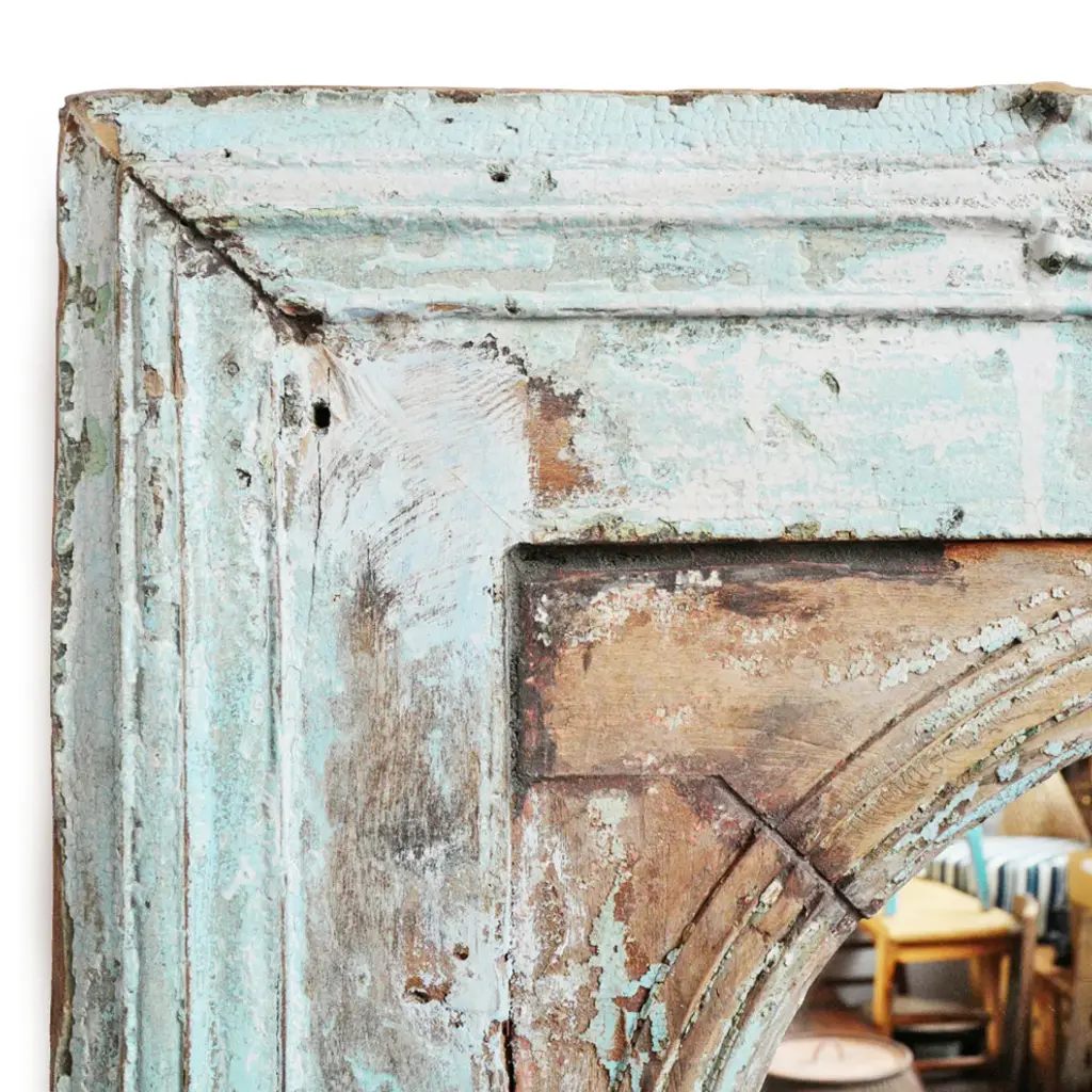 Vintage old teak window frame salvaged from North India and repurposed into a one of a kind beautiful arched mirror. Original aged worn patina with paint remnants.