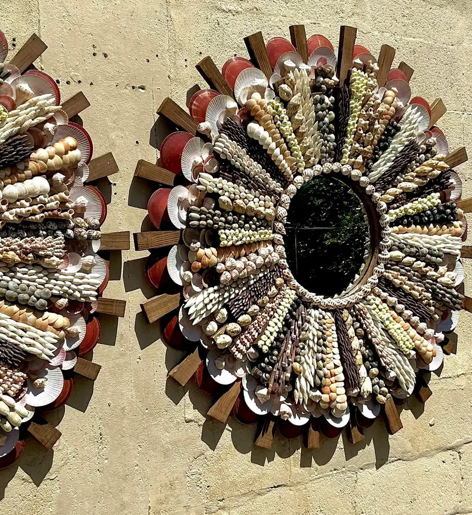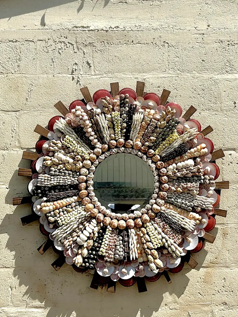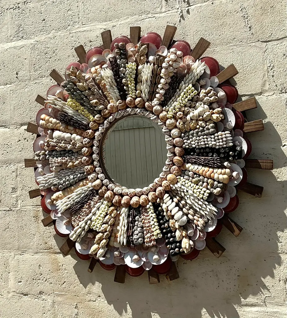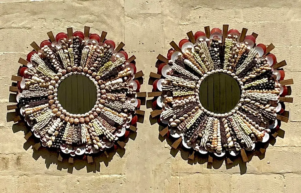 Bring a touch of the sea into your home with this stunning vintage coastal mirror, lavishly encrusted with an array of natural shells arranged in a mesmerizing sunburst design. Radiating seaside charm and artisanal craftsmanship, this one-of-a-kind mirror transforms any space into a serene coastal retreat. The earthy, oceanic tones paired with intricate textural layers make it a standout piece for beach houses, bohemian interiors, or eclectic galleries. In excellent vintage condition, this shell-encrusted mirror measures 45” W x 3.5” D x 45” H and is ready to be the focal point of any wall. Its bold, dimensional frame blends effortlessly with coastal, classic, and mid-century modern decor. Perfect above a console, fireplace, or entryway, this mirror invites natural light and artistic elegance into your space. Don’t miss the opportunity to own this conversation-starting coastal treasure. Two mirrors available on my Chairish page.