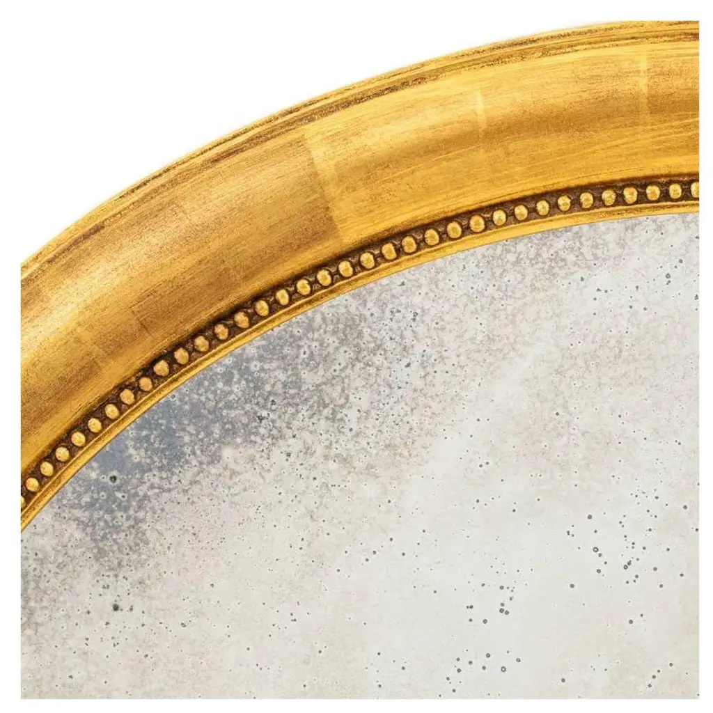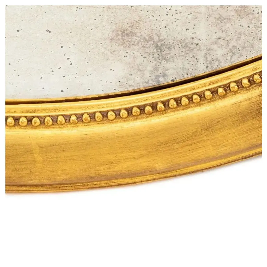 This large round mirror, crafted in the Federal style, showcases a beautiful giltwood frame adorned with intricate bead detailing. The mirror itself features an antiqued finish, offering a more subdued, atmospheric reflection rather than a sharp, clear image. This vintage-inspired touch enhances its timeless charm, Whether hung above a mantel, console, or in a hallway, this mirror captures the grace and sophistication of early American design.
