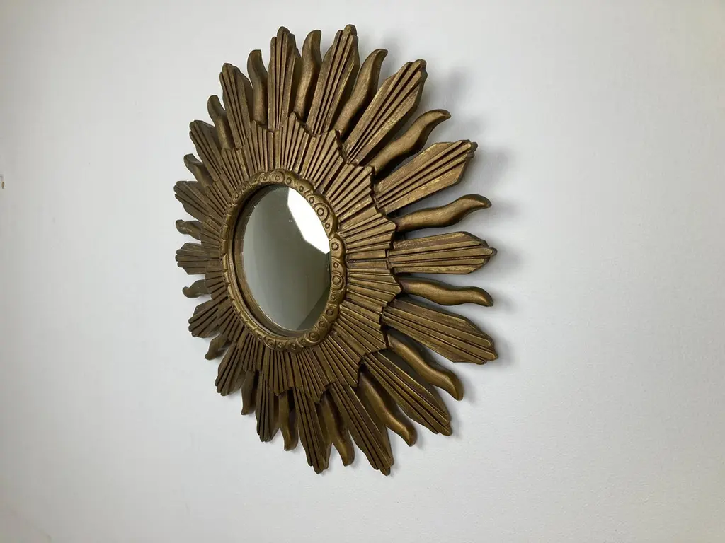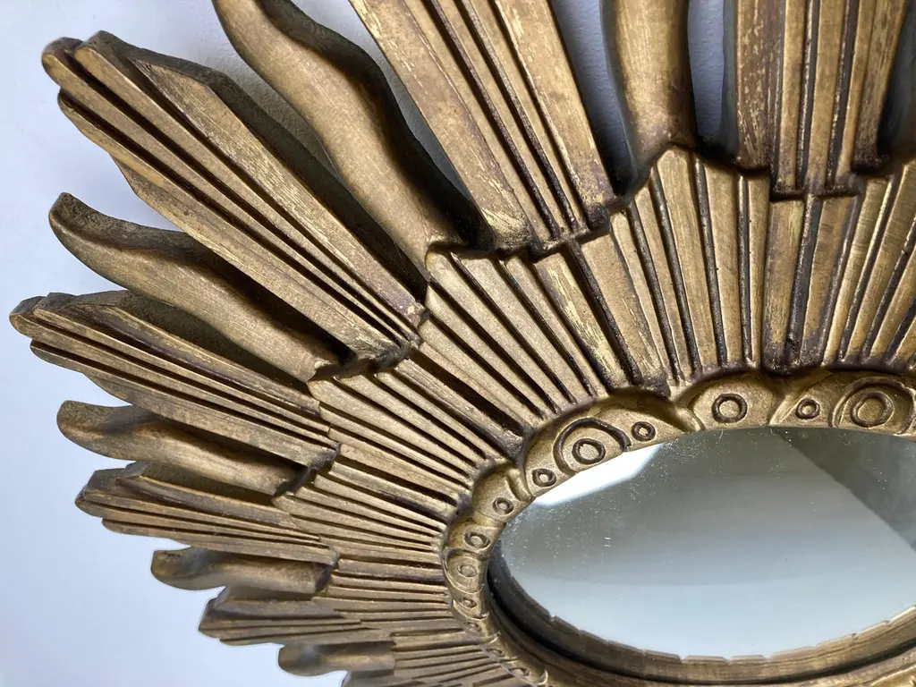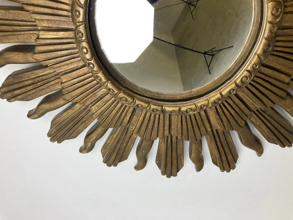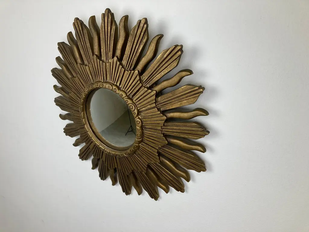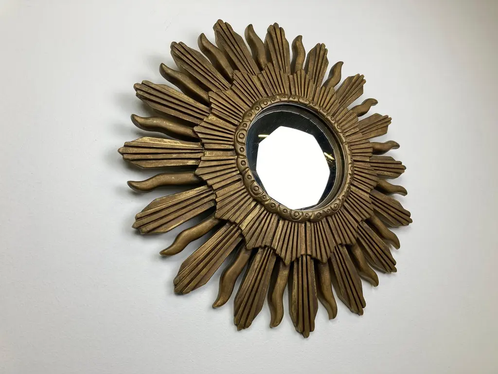Gilded resin sunburst mirror with convex mirror glass.The golden mirror is in a good condition.1960s - made in Belgium.Dimensions:Diameter: 47cm/18.50"Ref.: 8745646