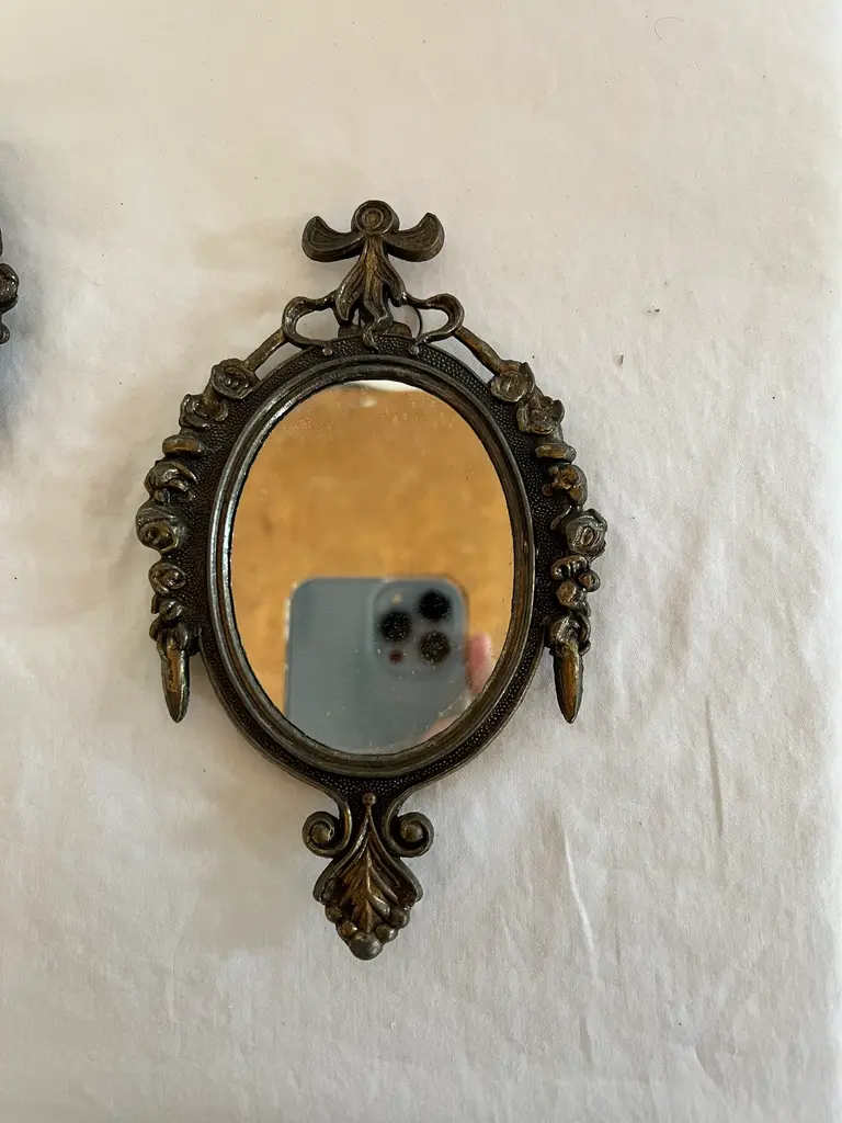Small Italian French style mirror measures 4” w x 6.5” h. Great for gallery or plate wall filler. Sold individually. 6 available.