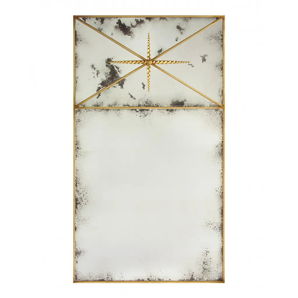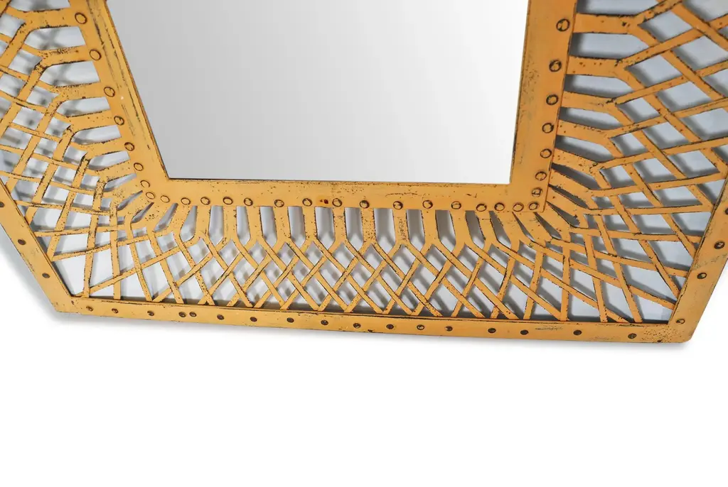 Vintage distressed peach painted iron work mirror frame. Beautiful aged solid iron and waxed patina. Added small rivet detail round the border. Fun colorful mirror to add extra interest to any space. Each is slightly unique.