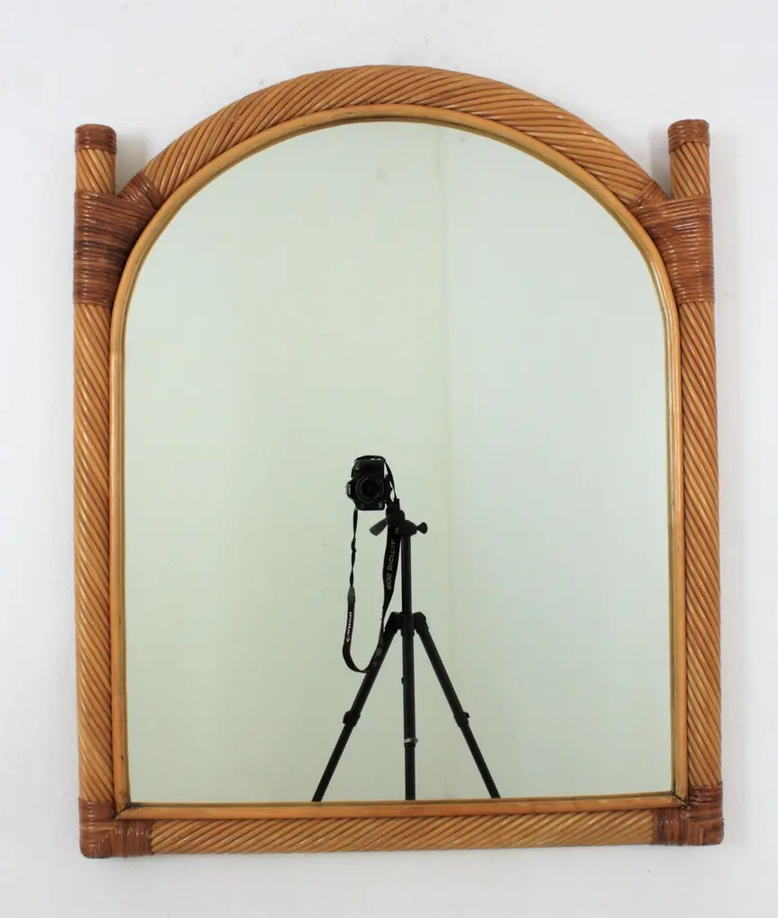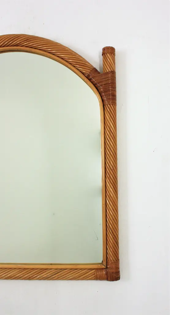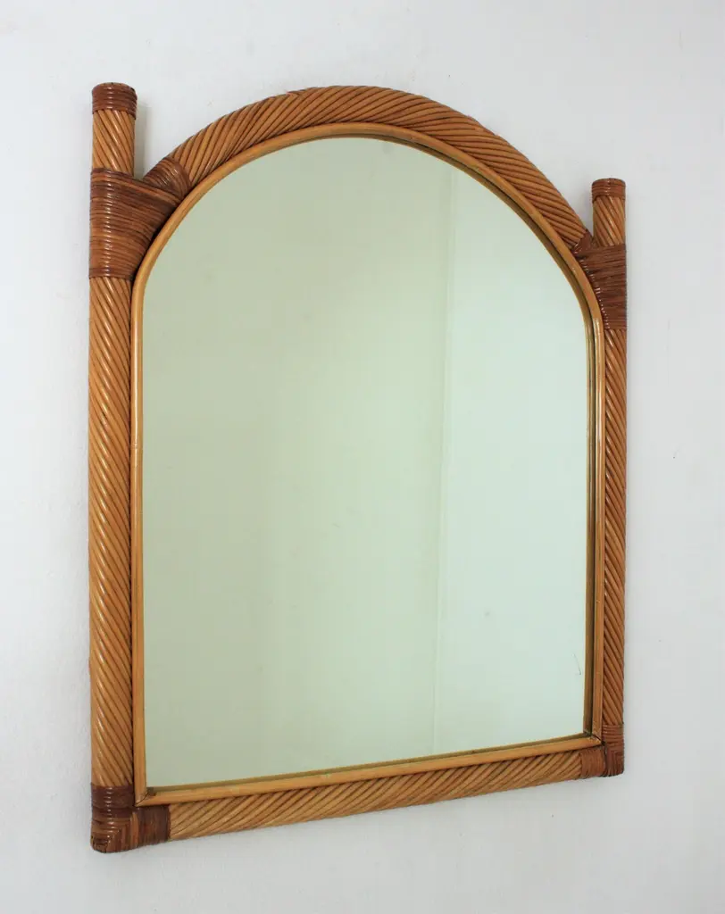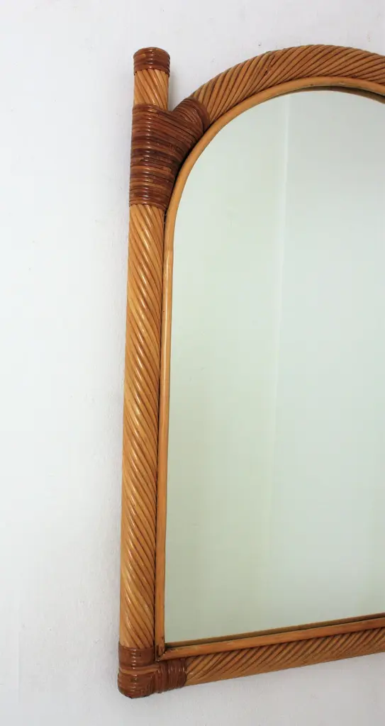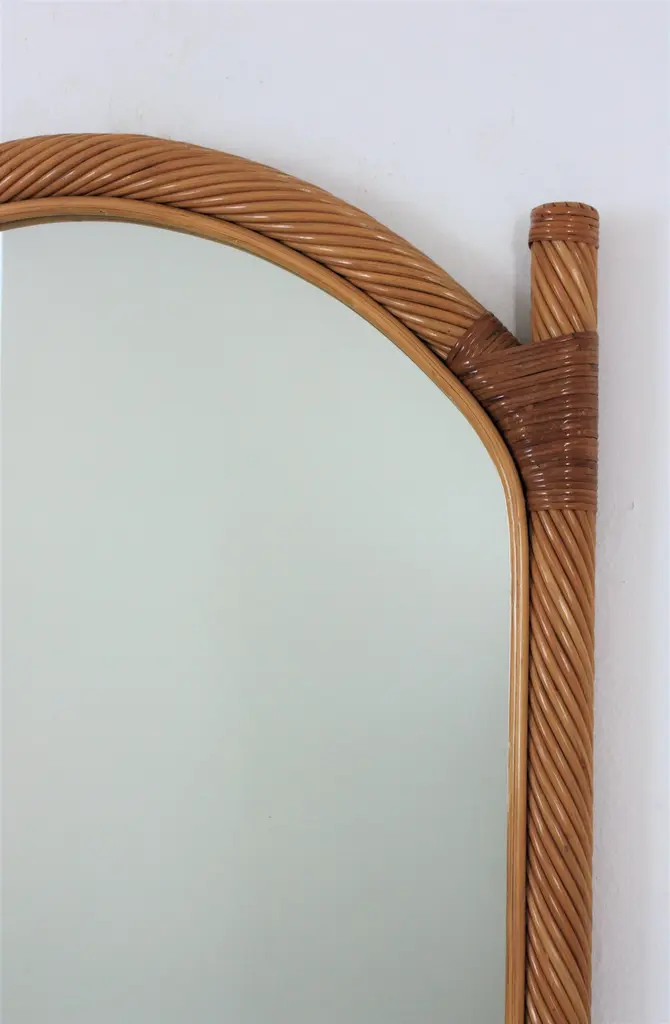 Organic Modern arched wall mirrors handcrafted in rattan. Attributed to Vivai del Sud. Italy, 1960s.These eye-catching mirrors feature finely executed frames with arched tops. Made of multiple layers of rattan canes. The layers of rattan are displayed in twisting disposition creating a beautiful frame.To be used as wall mirrors over a double vanity in a bathroom , as console mirrors in an entry hall or in any other room.Large mirror surface. Clean design and amazing shape.Slightly difference in size.Priced and sold individuallyMeasures: 97 cm H x 81 cm W x 6,5 cm D and 97,5 cm H x 80 cm W x 6,5 cm DGlass measures: 84 cm H x 68 cm W and 84 cm H x 67,5 cm W We are specialists in mirrors and sunburst mirrors: A curated selection is avaliable at our 1stdibs marketplace.Arched Mirror // Rattan Arched Mirror // Pencil Reed Mirror // Mid-century Modern Italian Mirror // Vivai Del Sud Mirror