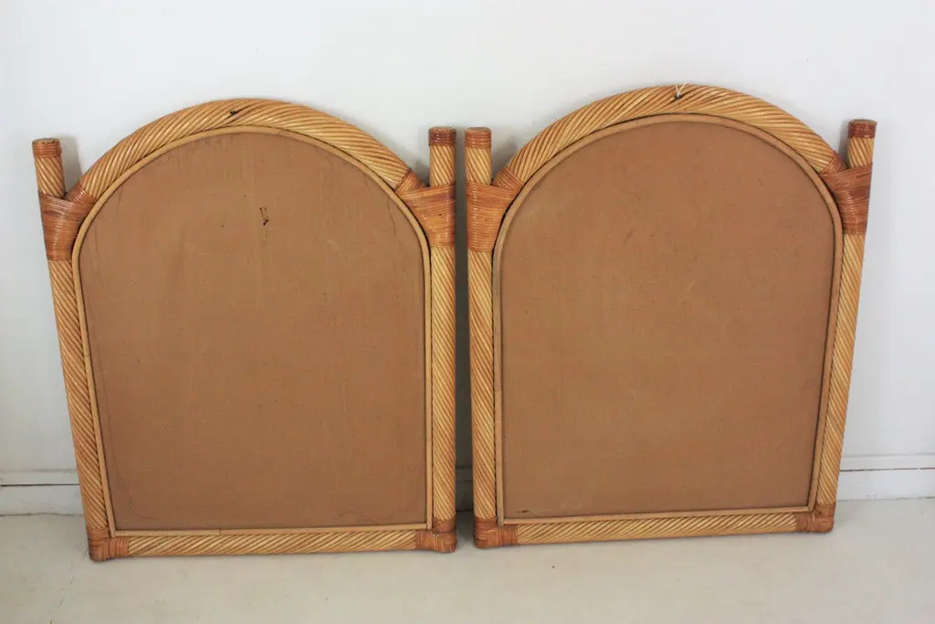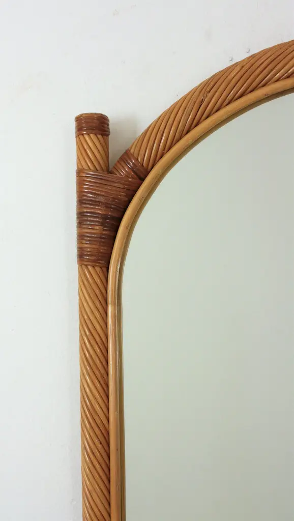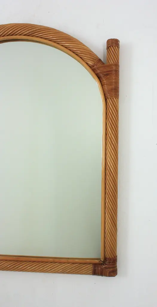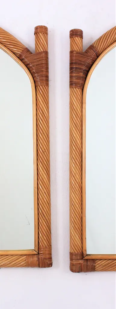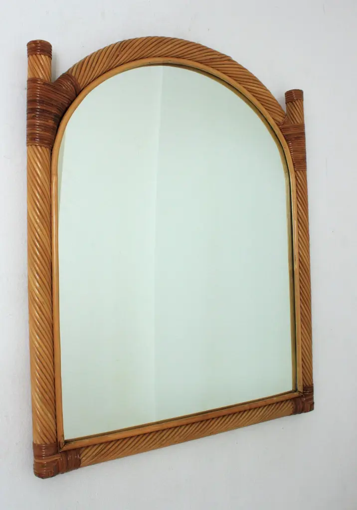 Organic Modern arched wall mirrors handcrafted in rattan. Attributed to Vivai del Sud. Italy, 1960s.These eye-catching mirrors feature finely executed frames with arched tops. Made of multiple layers of rattan canes. The layers of rattan are displayed in twisting disposition creating a beautiful frame.To be used as wall mirrors over a double vanity in a bathroom , as console mirrors in an entry hall or in any other room.Large mirror surface. Clean design and amazing shape.Slightly difference in size.Priced and sold individuallyMeasures: 97 cm H x 81 cm W x 6,5 cm D and 97,5 cm H x 80 cm W x 6,5 cm DGlass measures: 84 cm H x 68 cm W and 84 cm H x 67,5 cm W We are specialists in mirrors and sunburst mirrors: A curated selection is avaliable at our 1stdibs marketplace.Arched Mirror // Rattan Arched Mirror // Pencil Reed Mirror // Mid-century Modern Italian Mirror // Vivai Del Sud Mirror