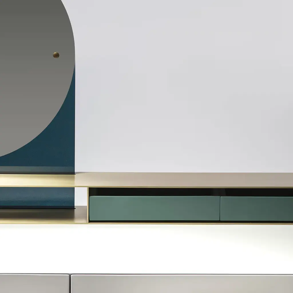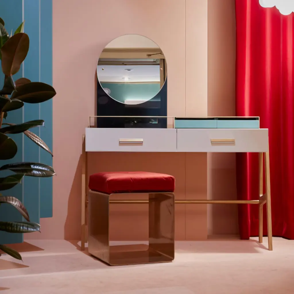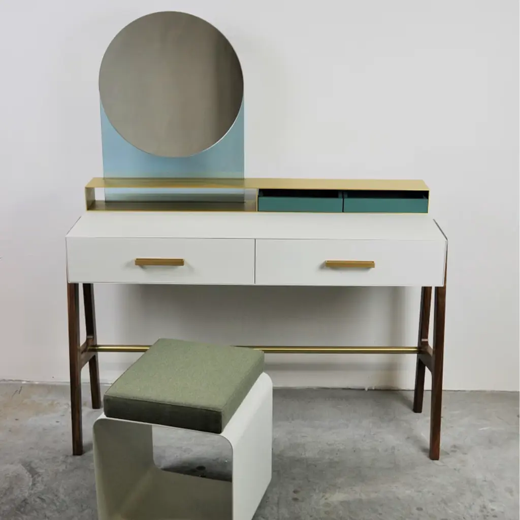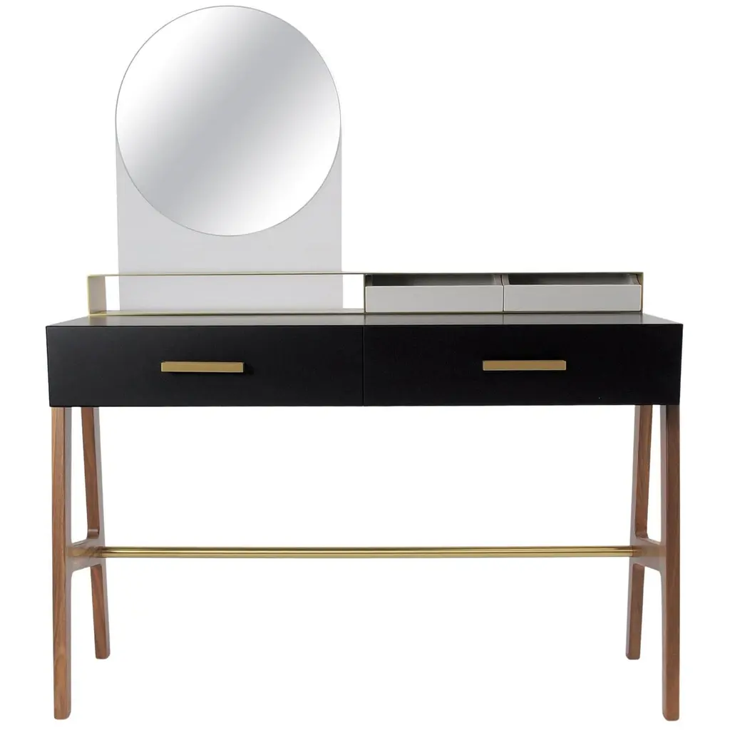 The epitome of modern elegance, the Vivian Vanity Desk with Mirror sports a slender and graceful silhouette that will bring an elegant element to any bedroom. Made of laminated plywood with a white lacquered finish, the rectangular frame includes two drawers with brass handles and an open brass shelf on top containing two small drawers with a turquoise finish to match the panel supporting the round mirror. Simple yet sophisticated, this design rests on four durmast wood legs (also available in walnut) with a brass cylindrical stretcher. The height of the desk is 74 cm. Please contact the Concierge for additional details.