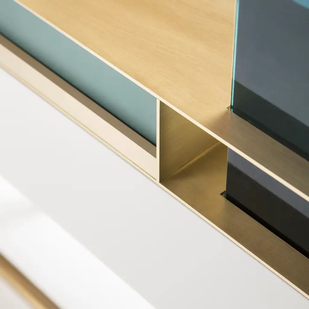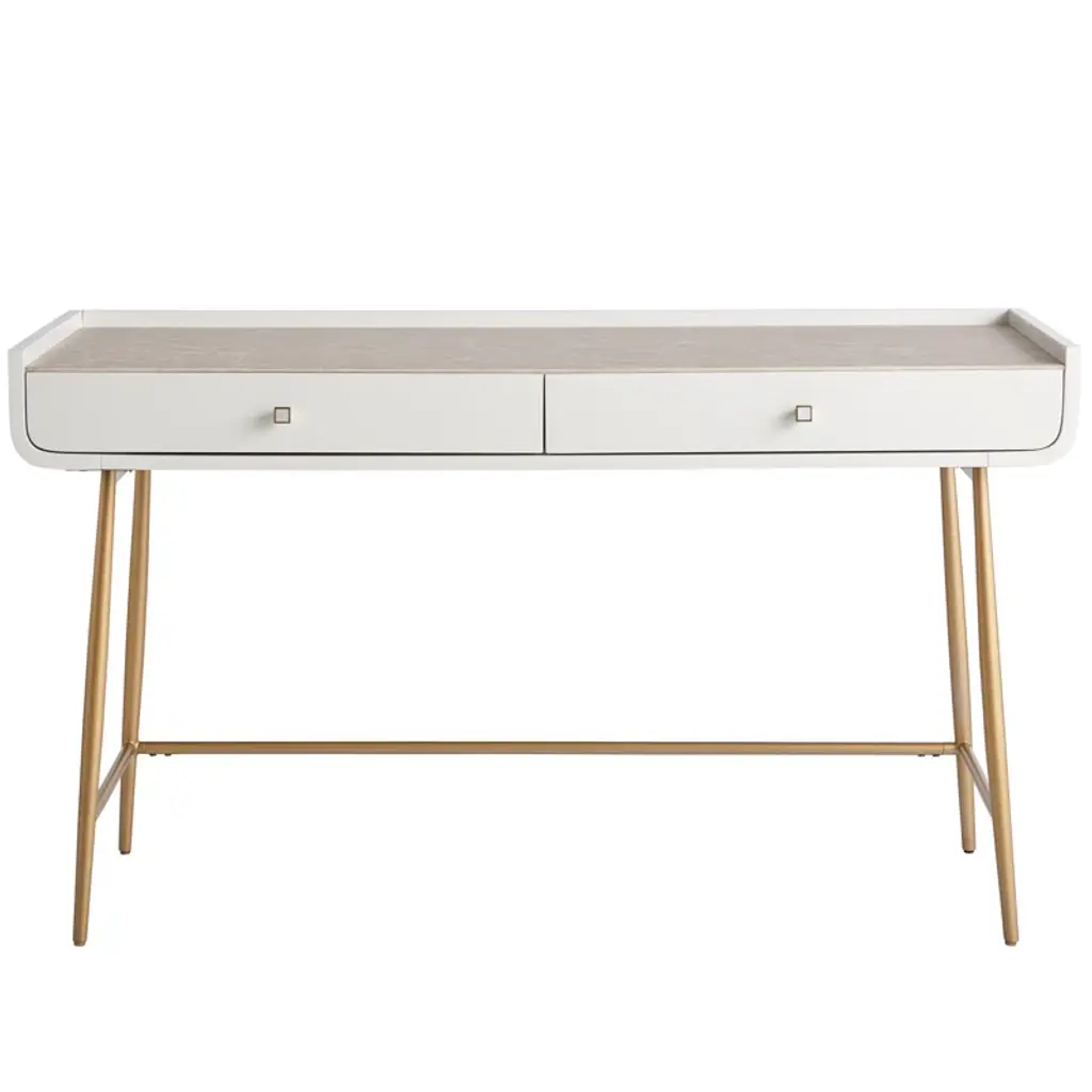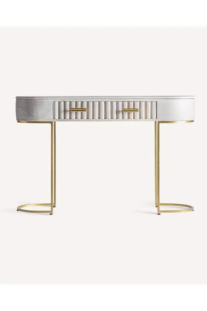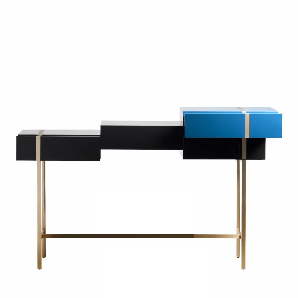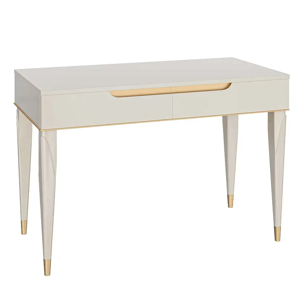 The epitome of modern elegance, the Vivian Vanity Desk with Mirror sports a slender and graceful silhouette that will bring an elegant element to any bedroom. Made of laminated plywood with a white lacquered finish, the rectangular frame includes two drawers with brass handles and an open brass shelf on top containing two small drawers with a turquoise finish to match the panel supporting the round mirror. Simple yet sophisticated, this design rests on four durmast wood legs (also available in walnut) with a brass cylindrical stretcher. The height of the desk is 74 cm. Please contact the Concierge for additional details.