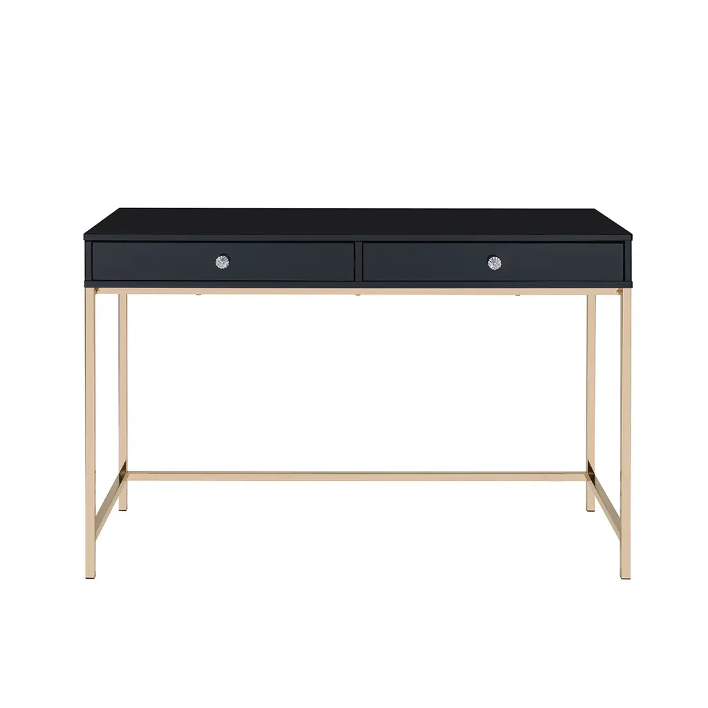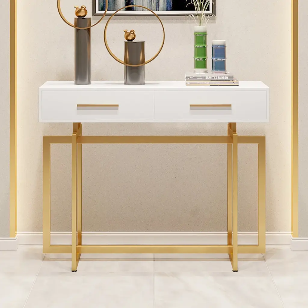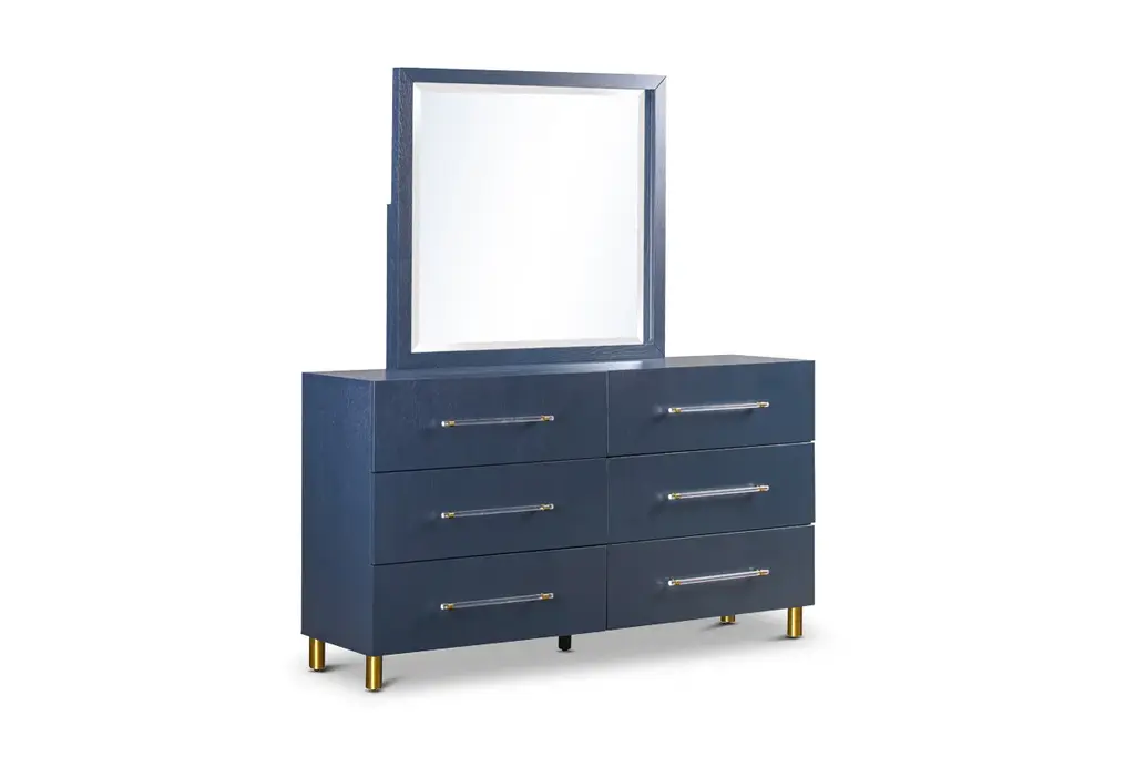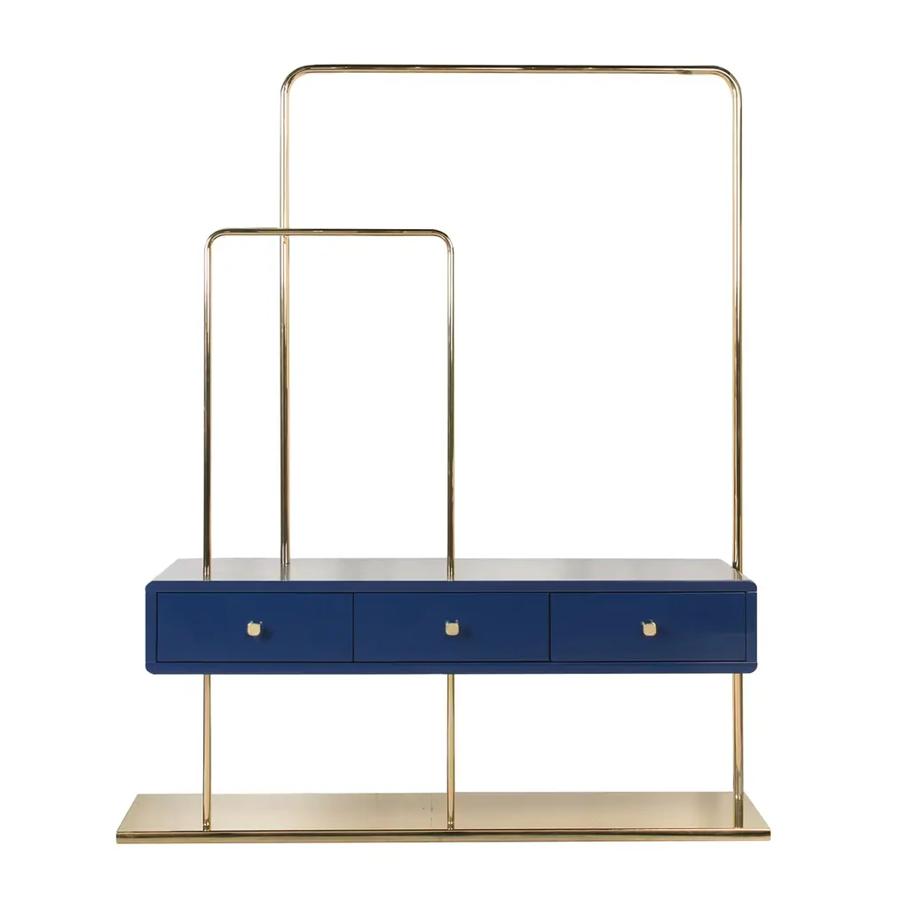 The epitome of modern elegance, the Vivian Vanity Desk with Mirror sports a slender and graceful silhouette that will bring an elegant element to any bedroom. Made of laminated plywood with a white lacquered finish, the rectangular frame includes two drawers with brass handles and an open brass shelf on top containing two small drawers with a turquoise finish to match the panel supporting the round mirror. Simple yet sophisticated, this design rests on four durmast wood legs (also available in walnut) with a brass cylindrical stretcher. The height of the desk is 74 cm. Please contact the Concierge for additional details.