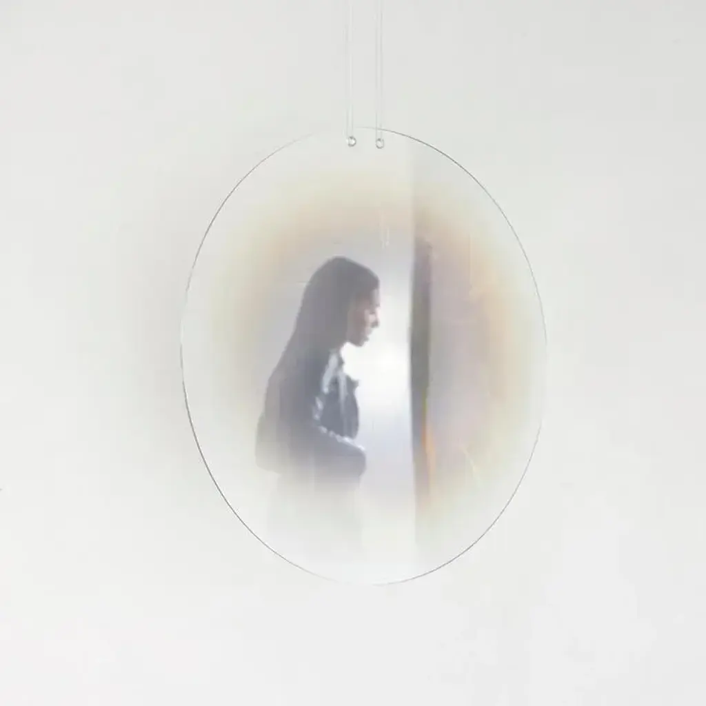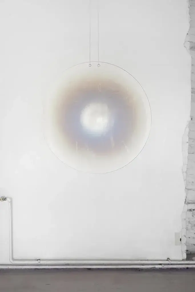 Void mirror by Boldizar Senteski Dimensions: D 90 cm Materials: oxidized silver, glass Unique, handmade suspended mirror piece with transparent to reflecting- oxidized silver gradient in the middle.
