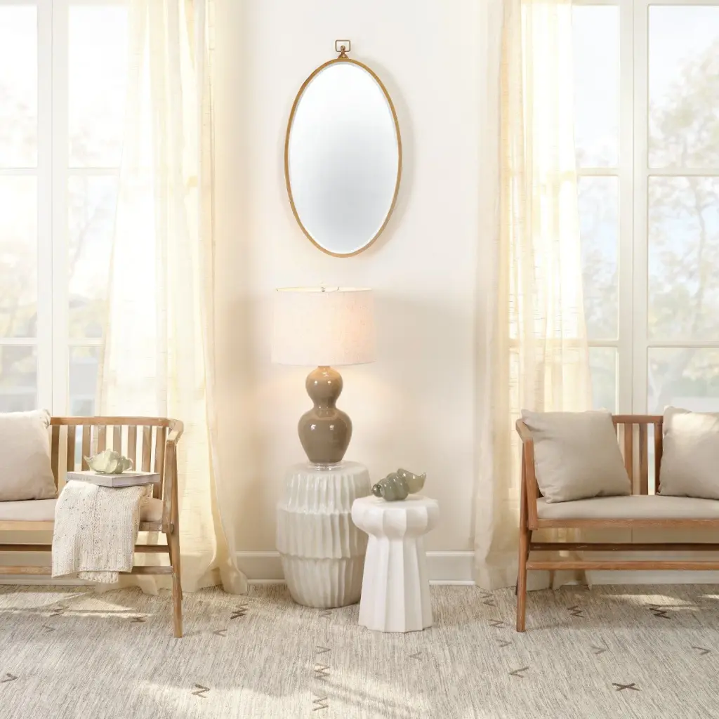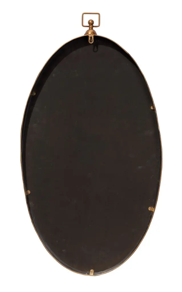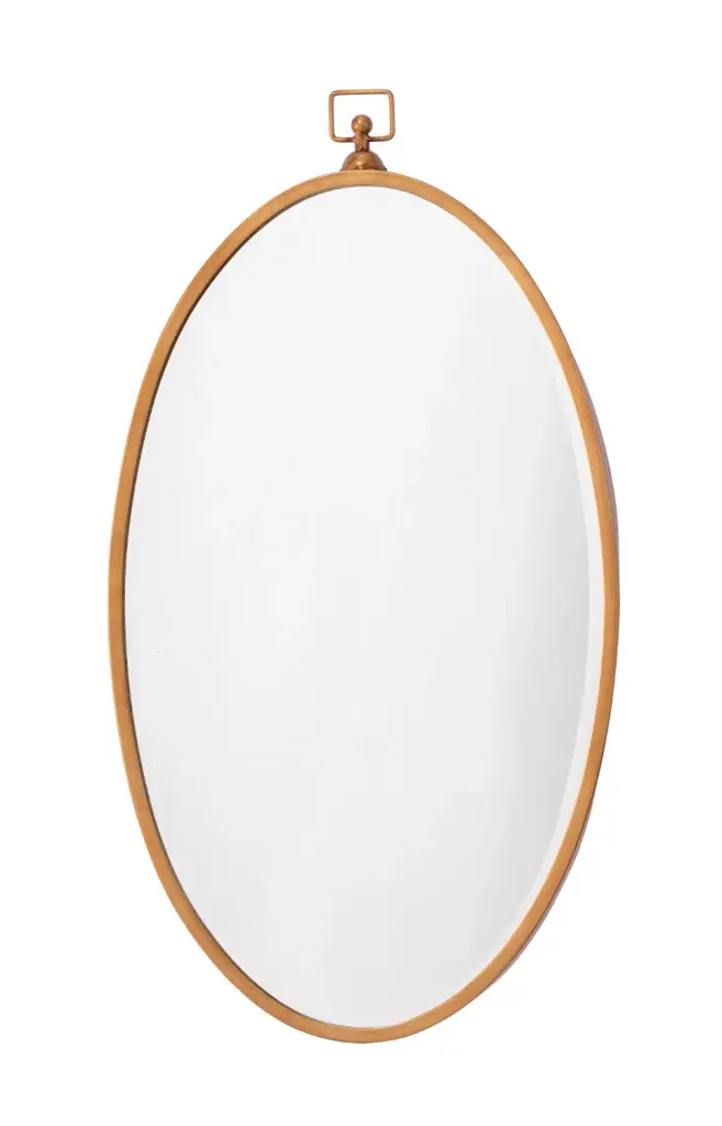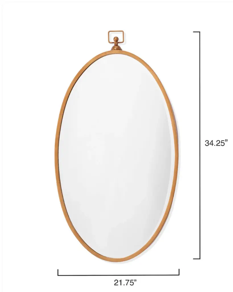 A modern take on an antique-inspired silhouette, this mirror will bring charm to a variety of décor styles. Featuring glass surrounded by a slim metal frame hand-finished in antique brass and the versatility of hanging horizontally and vertically. Mounted above a vanity, sideboard or dresser, its oval shape will soften any room while reflecting light to make your space feel bigger. Specifications