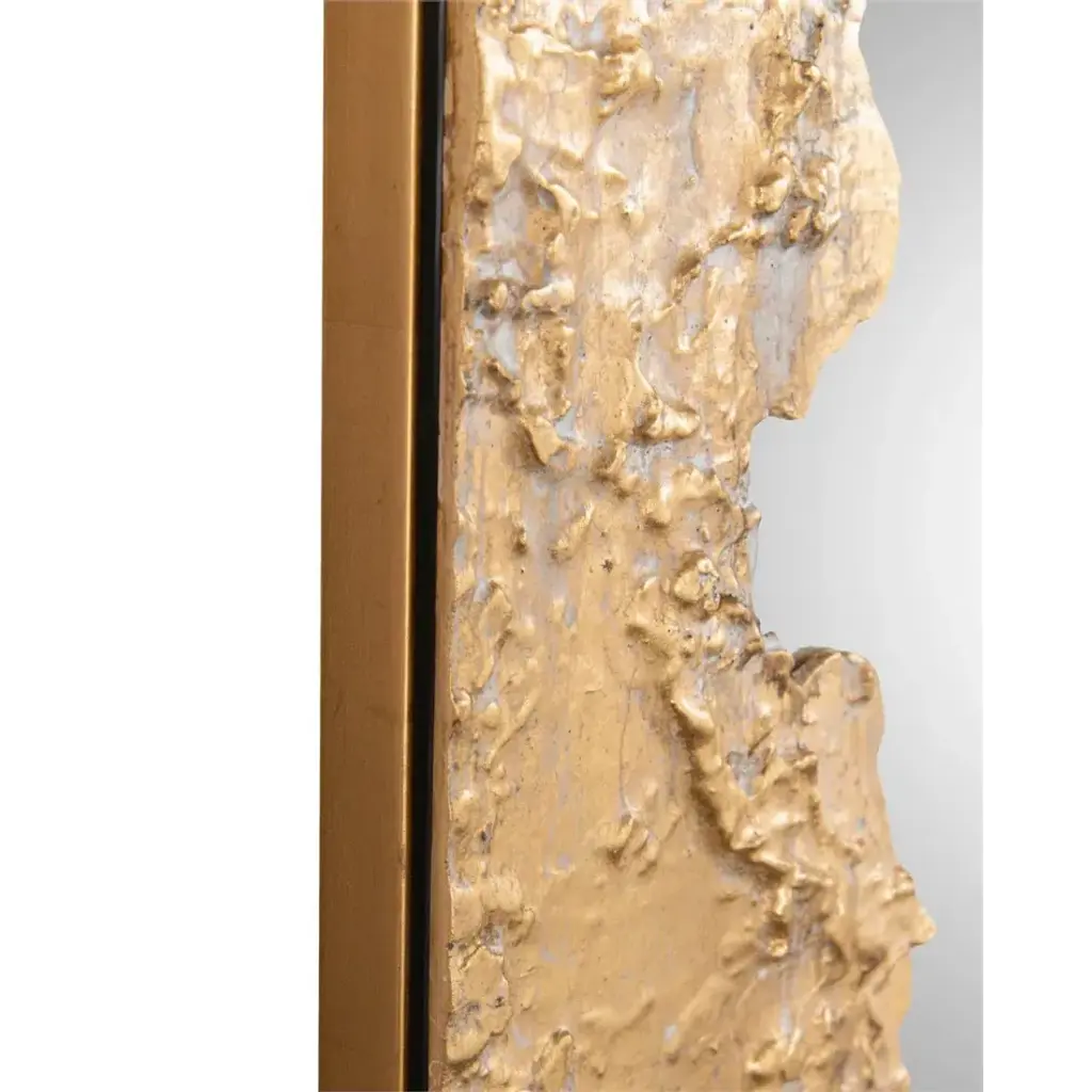 This transitional mirror features side frames in a molten relief texture of washed gold and a gold coast finish. French cleats are fitted.