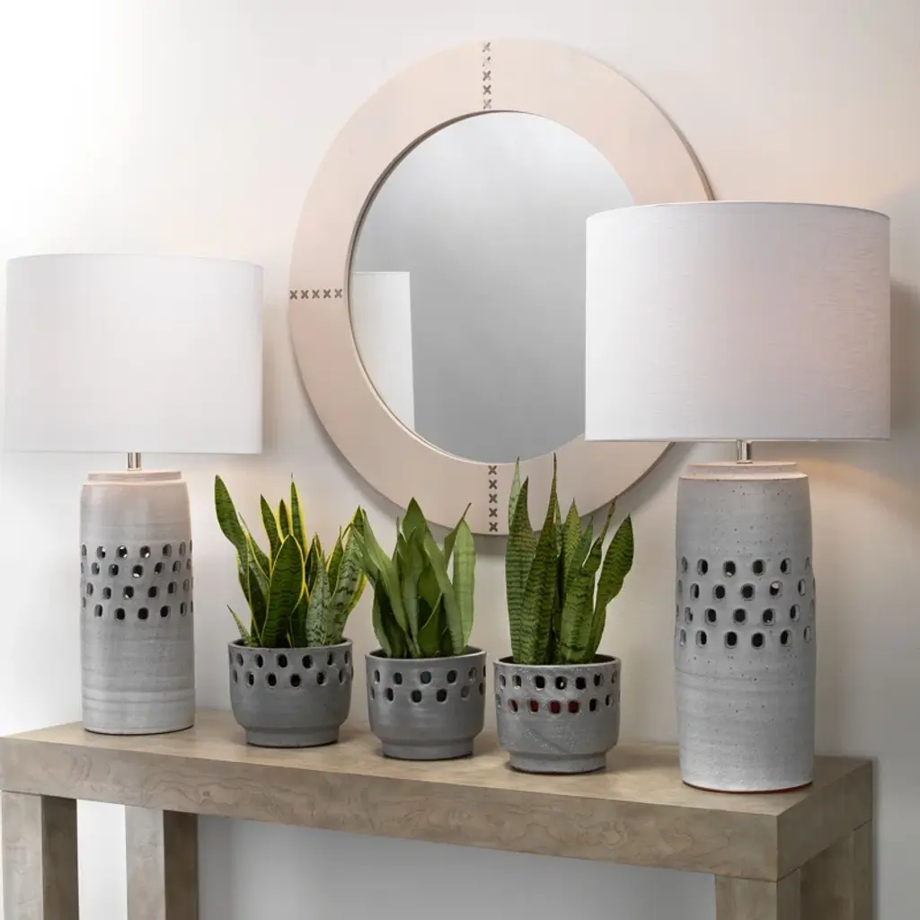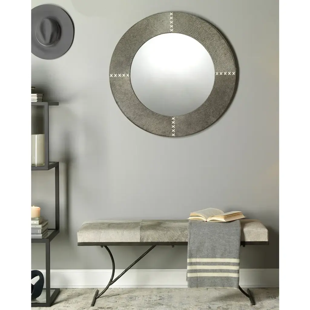 This beautiful mirror is created from naturally selected hair on hide, whip stitched together with white leather as a great accent.