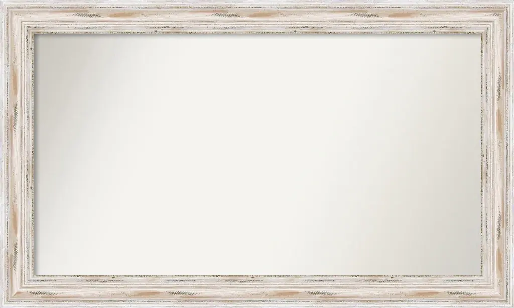Give your home or office the finishing touch with this custom wood Non-Beveled Wall Mirror framed with the Alexandria White Wash frame. Individually made using traditional custom framing techniques, it has the quality you would expect from your local frame shop. It holds its value with premium finishing that can be appreciated up close.Features: • MIRROR DETAILS: This mirror features premium glass for a clear, undistorted image and has a non-beveled surface to maximize the viewing area. The overall size of this custom wall mirror measures 45 x 27 inches, including the frame. Its reflective area measures 40 x 22 inches.• FRAME DETAILS: The Alexandria White Wash Frame is a wide, whitewashed frame with outer edge accents. The creamy white finish has tan distressing and weathered patches. The frame is 3 in. wide and stands 2 in. off the wall.• PROTECTIVE BACKING: This wall mirror is finished with a solid surface backing to ensure stability and prevent moisture and dust buildup.• HASSLE-FREE HANGING: All mirrors have durable hanging hardware attached to the back to hang vertically or horizontally, along with hanging hooks and nails.• ASSEMBLED IN THE USA: Each piece is assembled to order in Madison, WI USA.• FOR HOME OR COMMERCIAL USE: Because of our attention to detail and focus on artistry, architects, interior designers, and homeowners alike choose this mirror to create beautiful living spaces.