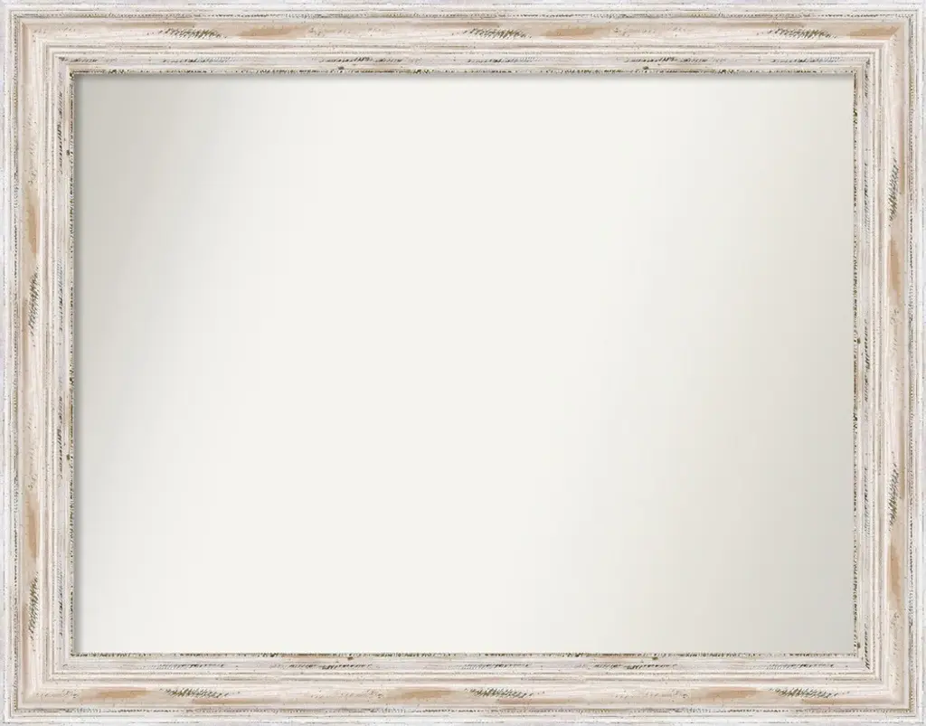 Give your home or office the finishing touch with this custom wood Non-Beveled Wall Mirror framed with the Alexandria White Wash frame. Individually made using traditional custom framing techniques, it has the quality you would expect from your local frame shop. It holds its value with premium finishing that can be appreciated up close.Features: • MIRROR DETAILS: This mirror features premium glass for a clear, undistorted image and has a non-beveled surface to maximize the viewing area. The overall size of this custom wall mirror measures 37 x 29 inches, including the frame. Its reflective area measures 32 x 24 inches.• FRAME DETAILS: The Alexandria White Wash Frame is a wide, whitewashed frame with outer edge accents. The creamy white finish has tan distressing and weathered patches. The frame is 3 in. wide and stands 2 in. off the wall.• PROTECTIVE BACKING: This wall mirror is finished with a solid surface backing to ensure stability and prevent moisture and dust buildup.• HASSLE-FREE HANGING: All mirrors have durable hanging hardware attached to the back to hang vertically or horizontally, along with hanging hooks and nails.• ASSEMBLED IN THE USA: Each piece is assembled to order in Madison, WI USA.• FOR HOME OR COMMERCIAL USE: Because of our attention to detail and focus on artistry, architects, interior designers, and homeowners alike choose this mirror to create beautiful living spaces.