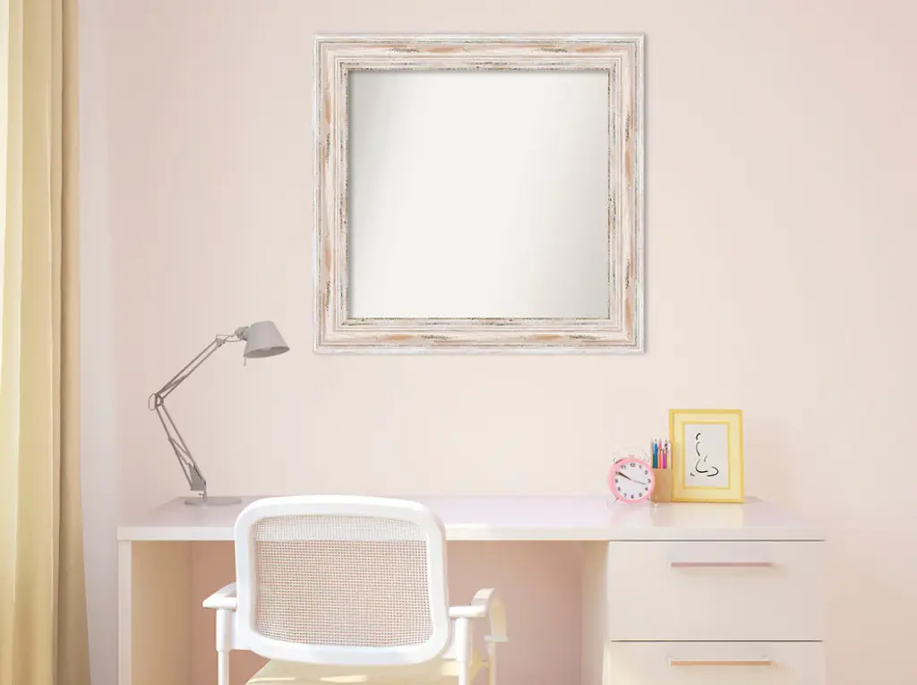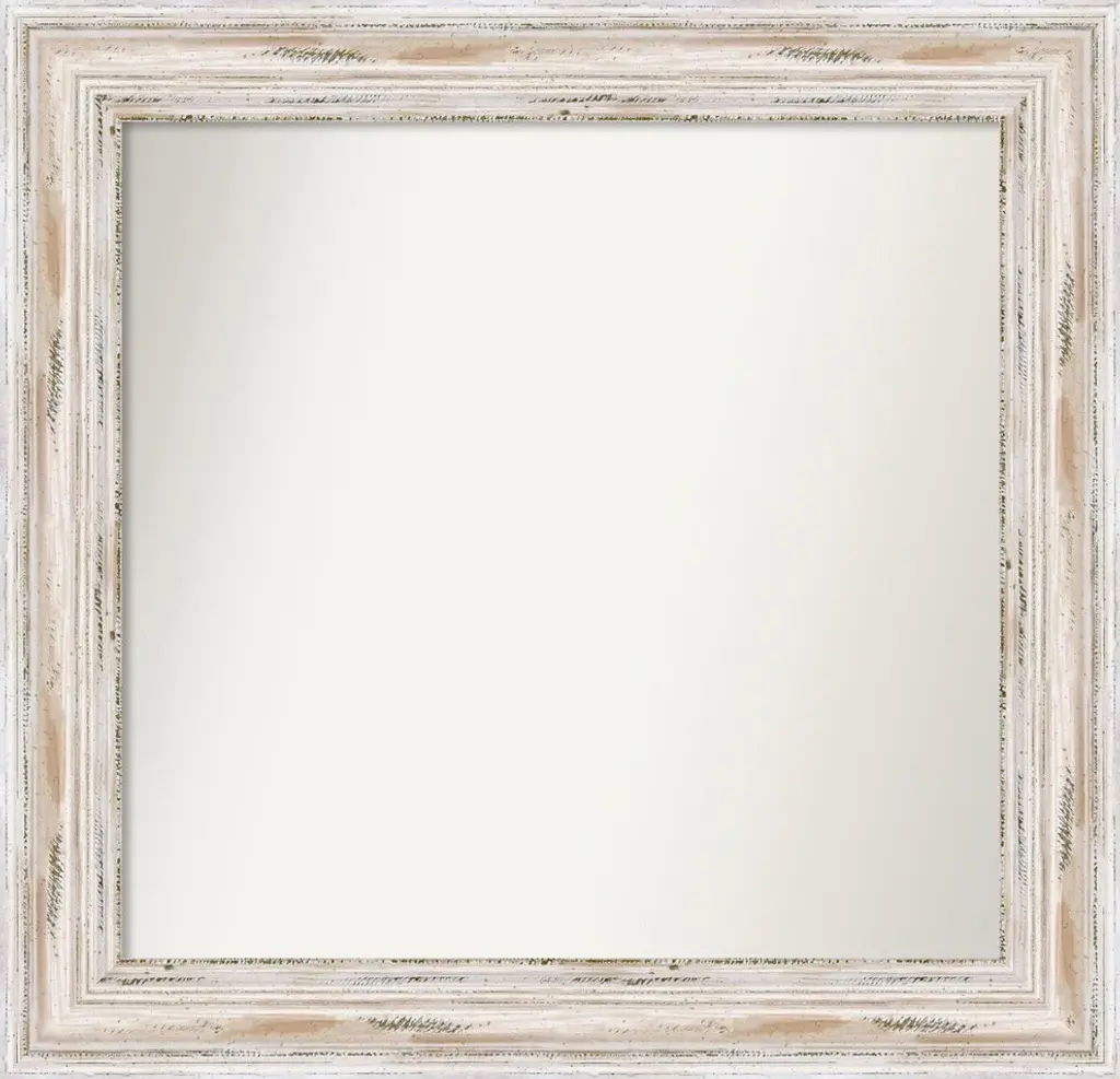 Give your home or office the finishing touch with this custom wood Non-Beveled Wall Mirror framed with the Alexandria White Wash frame. Individually made using traditional custom framing techniques, it has the quality you would expect from your local frame shop. It holds its value with premium finishing that can be appreciated up close.Features: • MIRROR DETAILS: This mirror features premium glass for a clear, undistorted image and has a non-beveled surface to maximize the viewing area. The overall size of this custom wall mirror measures 27 x 26 inches, including the frame. Its reflective area measures 22 x 21 inches.• FRAME DETAILS: The Alexandria White Wash Frame is a wide, whitewashed frame with outer edge accents. The creamy white finish has tan distressing and weathered patches. The frame is 3 in. wide and stands 2 in. off the wall.• PROTECTIVE BACKING: This wall mirror is finished with a solid surface backing to ensure stability and prevent moisture and dust buildup.• HASSLE-FREE HANGING: All mirrors have durable hanging hardware attached to the back to hang vertically or horizontally, along with hanging hooks and nails.• ASSEMBLED IN THE USA: Each piece is assembled to order in Madison, WI USA.• FOR HOME OR COMMERCIAL USE: Because of our attention to detail and focus on artistry, architects, interior designers, and homeowners alike choose this mirror to create beautiful living spaces.