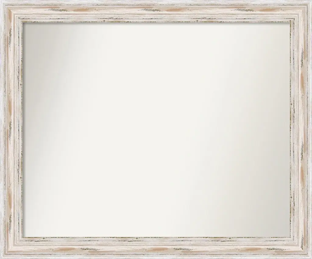 Give your home or office the finishing touch with this custom wood Non-Beveled Wall Mirror framed with the Alexandria White Wash frame. Individually made using traditional custom framing techniques, it has the quality you would expect from your local frame shop. It holds its value with premium finishing that can be appreciated up close.Features: • MIRROR DETAILS: This mirror features premium glass for a clear, undistorted image and has a non-beveled surface to maximize the viewing area. The overall size of this custom wall mirror measures 41 x 34 inches, including the frame. Its reflective area measures 36 x 29 inches.• FRAME DETAILS: The Alexandria White Wash Frame is a wide, whitewashed frame with outer edge accents. The creamy white finish has tan distressing and weathered patches. The frame is 3 in. wide and stands 2 in. off the wall.• PROTECTIVE BACKING: This wall mirror is finished with a solid surface backing to ensure stability and prevent moisture and dust buildup.• HASSLE-FREE HANGING: All mirrors have durable hanging hardware attached to the back to hang vertically or horizontally, along with hanging hooks and nails.• ASSEMBLED IN THE USA: Each piece is assembled to order in Madison, WI USA.• FOR HOME OR COMMERCIAL USE: Because of our attention to detail and focus on artistry, architects, interior designers, and homeowners alike choose this mirror to create beautiful living spaces.