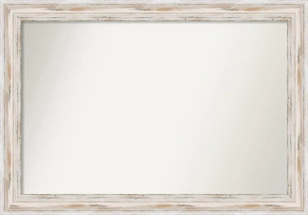 Give your home or office the finishing touch with this custom wood Non-Beveled Wall Mirror framed with the Alexandria White Wash frame. Individually made using traditional custom framing techniques, it has the quality you would expect from your local frame shop. It holds its value with premium finishing that can be appreciated up close.Features: • MIRROR DETAILS: This mirror features premium glass for a clear, undistorted image and has a non-beveled surface to maximize the viewing area. The overall size of this custom wall mirror measures 43 x 30 inches, including the frame. Its reflective area measures 38 x 25 inches.• FRAME DETAILS: The Alexandria White Wash Frame is a wide, whitewashed frame with outer edge accents. The creamy white finish has tan distressing and weathered patches. The frame is 3 in. wide and stands 2 in. off the wall.• PROTECTIVE BACKING: This wall mirror is finished with a solid surface backing to ensure stability and prevent moisture and dust buildup.• HASSLE-FREE HANGING: All mirrors have durable hanging hardware attached to the back to hang vertically or horizontally, along with hanging hooks and nails.• ASSEMBLED IN THE USA: Each piece is assembled to order in Madison, WI USA.• FOR HOME OR COMMERCIAL USE: Because of our attention to detail and focus on artistry, architects, interior designers, and homeowners alike choose this mirror to create beautiful living spaces.