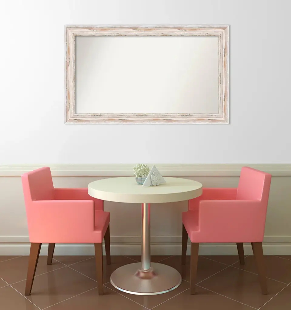 Give your home or office the finishing touch with this custom wood Non-Beveled Wall Mirror framed with the Alexandria White Wash frame. Individually made using traditional custom framing techniques, it has the quality you would expect from your local frame shop. It holds its value with premium finishing that can be appreciated up close.Features: • MIRROR DETAILS: This mirror features premium glass for a clear, undistorted image and has a non-beveled surface to maximize the viewing area. The overall size of this custom wall mirror measures 37 x 34 inches, including the frame. Its reflective area measures 32 x 29 inches.• FRAME DETAILS: The Alexandria White Wash Frame is a wide, whitewashed frame with outer edge accents. The creamy white finish has tan distressing and weathered patches. The frame is 3 in. wide and stands 2 in. off the wall.• PROTECTIVE BACKING: This wall mirror is finished with a solid surface backing to ensure stability and prevent moisture and dust buildup.• HASSLE-FREE HANGING: All mirrors have durable hanging hardware attached to the back to hang vertically or horizontally, along with hanging hooks and nails.• ASSEMBLED IN THE USA: Each piece is assembled to order in Madison, WI USA.• FOR HOME OR COMMERCIAL USE: Because of our attention to detail and focus on artistry, architects, interior designers, and homeowners alike choose this mirror to create beautiful living spaces.