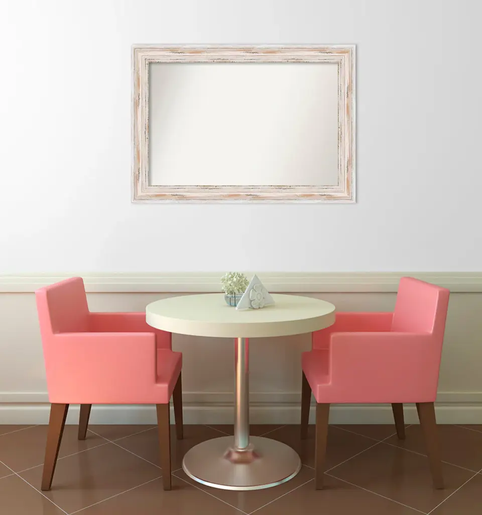 Give your home or office the finishing touch with this custom wood Non-Beveled Wall Mirror framed with the Alexandria White Wash frame. Individually made using traditional custom framing techniques, it has the quality you would expect from your local frame shop. It holds its value with premium finishing that can be appreciated up close.Features: • MIRROR DETAILS: This mirror features premium glass for a clear, undistorted image and has a non-beveled surface to maximize the viewing area. The overall size of this custom wall mirror measures 37 x 26 inches, including the frame. Its reflective area measures 32 x 21 inches.• FRAME DETAILS: The Alexandria White Wash Frame is a wide, whitewashed frame with outer edge accents. The creamy white finish has tan distressing and weathered patches. The frame is 3 in. wide and stands 2 in. off the wall.• PROTECTIVE BACKING: This wall mirror is finished with a solid surface backing to ensure stability and prevent moisture and dust buildup.• HASSLE-FREE HANGING: All mirrors have durable hanging hardware attached to the back to hang vertically or horizontally, along with hanging hooks and nails.• ASSEMBLED IN THE USA: Each piece is assembled to order in Madison, WI USA.• FOR HOME OR COMMERCIAL USE: Because of our attention to detail and focus on artistry, architects, interior designers, and homeowners alike choose this mirror to create beautiful living spaces.