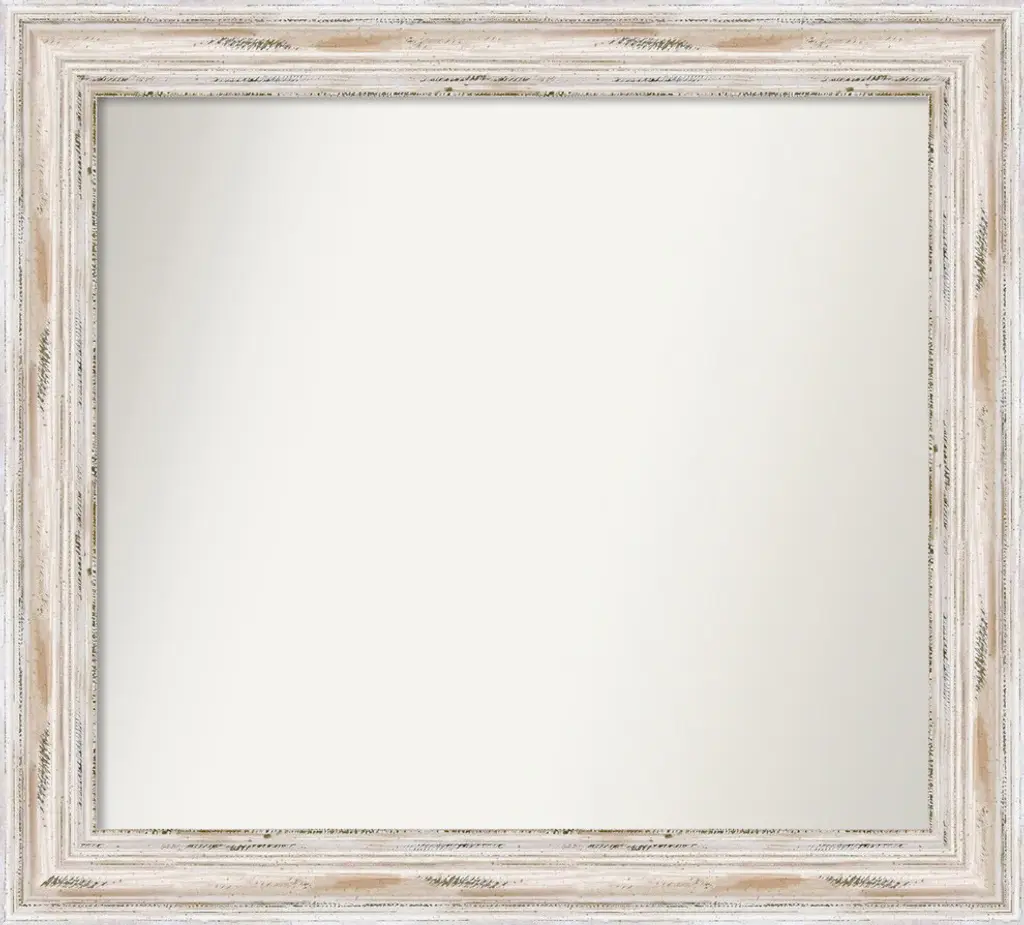 Give your home or office the finishing touch with this custom wood Non-Beveled Wall Mirror framed with the Alexandria White Wash frame. Individually made using traditional custom framing techniques, it has the quality you would expect from your local frame shop. It holds its value with premium finishing that can be appreciated up close.Features: • MIRROR DETAILS: This mirror features premium glass for a clear, undistorted image and has a non-beveled surface to maximize the viewing area. The overall size of this custom wall mirror measures 31 x 28 inches, including the frame. Its reflective area measures 26 x 23 inches.• FRAME DETAILS: The Alexandria White Wash Frame is a wide, whitewashed frame with outer edge accents. The creamy white finish has tan distressing and weathered patches. The frame is 3 in. wide and stands 2 in. off the wall.• PROTECTIVE BACKING: This wall mirror is finished with a solid surface backing to ensure stability and prevent moisture and dust buildup.• HASSLE-FREE HANGING: All mirrors have durable hanging hardware attached to the back to hang vertically or horizontally, along with hanging hooks and nails.• ASSEMBLED IN THE USA: Each piece is assembled to order in Madison, WI USA.• FOR HOME OR COMMERCIAL USE: Because of our attention to detail and focus on artistry, architects, interior designers, and homeowners alike choose this mirror to create beautiful living spaces.