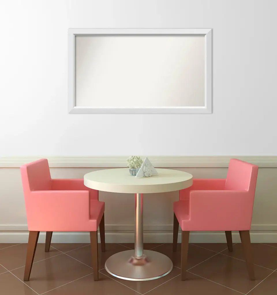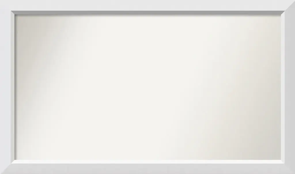 Give your home or office the finishing touch with this custom wood Non-Beveled Wall Mirror framed with the Blanco White frame. Individually made using traditional custom framing techniques, it has the quality you would expect from your local frame shop. It holds its value with premium finishing that can be appreciated up close.Features: • MIRROR DETAILS: This mirror features premium glass for a clear, undistorted image and has a non-beveled surface to maximize the viewing area. The overall size of this custom wall mirror measures 41.5 x 24.5 inches, including the frame. Its reflective area measures 38 x 21 inches.• FRAME DETAILS: The Blanco White Frame is a geometric white frame with a flat face and an angled inner edge with a smooth satin finish. The frame is 2 in. wide and stands 1.25 in. off the wall.• PROTECTIVE BACKING: This wall mirror is finished with a solid surface backing to ensure stability and prevent moisture and dust buildup.• HASSLE-FREE HANGING: All mirrors have durable hanging hardware attached to the back to hang vertically or horizontally, along with hanging hooks and nails.• ASSEMBLED IN THE USA: Each piece is assembled to order in Madison, WI USA.• FOR HOME OR COMMERCIAL USE: Because of our attention to detail and focus on artistry, architects, interior designers, and homeowners alike choose this mirror to create beautiful living spaces.