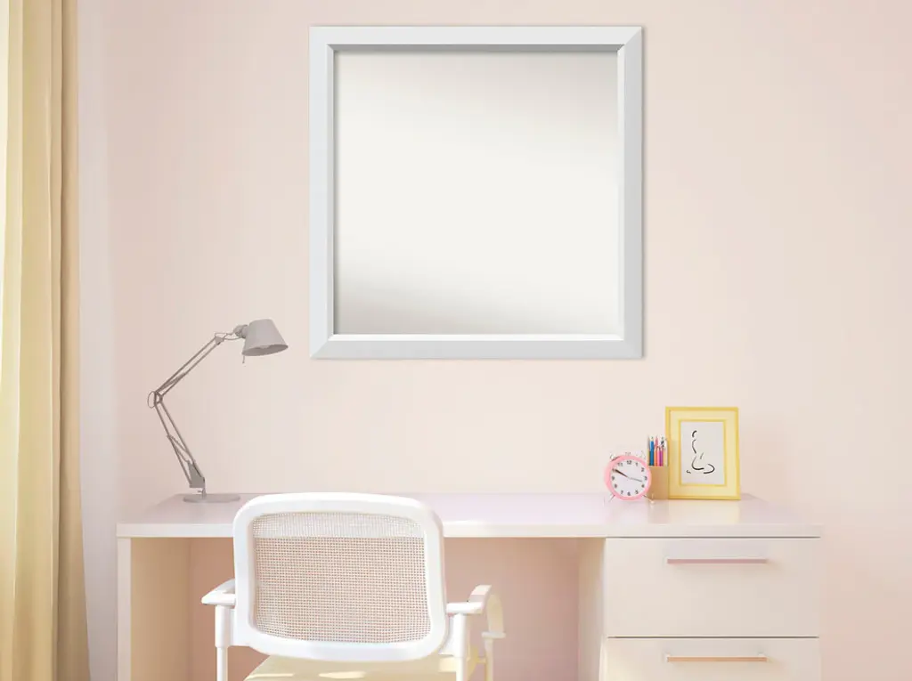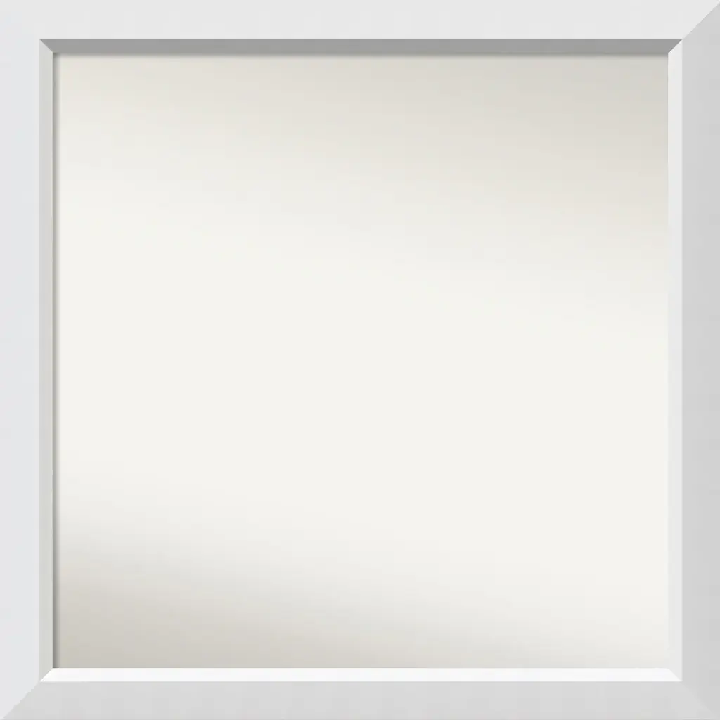 Give your home or office the finishing touch with this custom wood Non-Beveled Wall Mirror framed with the Blanco White frame. Individually made using traditional custom framing techniques, it has the quality you would expect from your local frame shop. It holds its value with premium finishing that can be appreciated up close.Features: • MIRROR DETAILS: This mirror features premium glass for a clear, undistorted image and has a non-beveled surface to maximize the viewing area. The overall size of this custom wall mirror measures 27.5 x 27.5 inches, including the frame. Its reflective area measures 24 x 24 inches.• FRAME DETAILS: The Blanco White Frame is a geometric white frame with a flat face and an angled inner edge with a smooth satin finish. The frame is 2 in. wide and stands 1.25 in. off the wall.• PROTECTIVE BACKING: This wall mirror is finished with a solid surface backing to ensure stability and prevent moisture and dust buildup.• HASSLE-FREE HANGING: All mirrors have durable hanging hardware attached to the back to hang vertically or horizontally, along with hanging hooks and nails.• ASSEMBLED IN THE USA: Each piece is assembled to order in Madison, WI USA.• FOR HOME OR COMMERCIAL USE: Because of our attention to detail and focus on artistry, architects, interior designers, and homeowners alike choose this mirror to create beautiful living spaces.