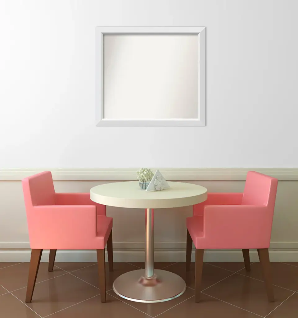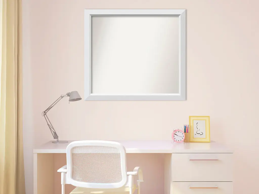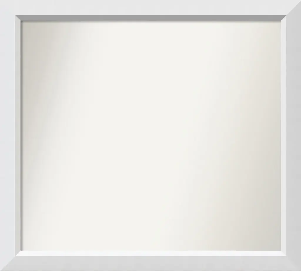 Give your home or office the finishing touch with this custom wood Non-Beveled Wall Mirror framed with the Blanco White frame. Individually made using traditional custom framing techniques, it has the quality you would expect from your local frame shop. It holds its value with premium finishing that can be appreciated up close.Features: • MIRROR DETAILS: This mirror features premium glass for a clear, undistorted image and has a non-beveled surface to maximize the viewing area. The overall size of this custom wall mirror measures 29.5 x 26.5 inches, including the frame. Its reflective area measures 26 x 23 inches.• FRAME DETAILS: The Blanco White Frame is a geometric white frame with a flat face and an angled inner edge with a smooth satin finish. The frame is 2 in. wide and stands 1.25 in. off the wall.• PROTECTIVE BACKING: This wall mirror is finished with a solid surface backing to ensure stability and prevent moisture and dust buildup.• HASSLE-FREE HANGING: All mirrors have durable hanging hardware attached to the back to hang vertically or horizontally, along with hanging hooks and nails.• ASSEMBLED IN THE USA: Each piece is assembled to order in Madison, WI USA.• FOR HOME OR COMMERCIAL USE: Because of our attention to detail and focus on artistry, architects, interior designers, and homeowners alike choose this mirror to create beautiful living spaces.