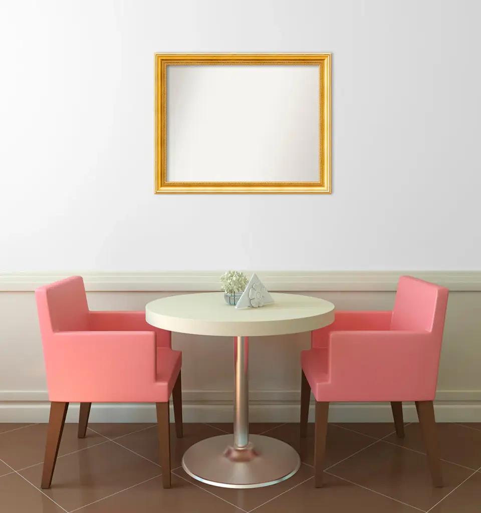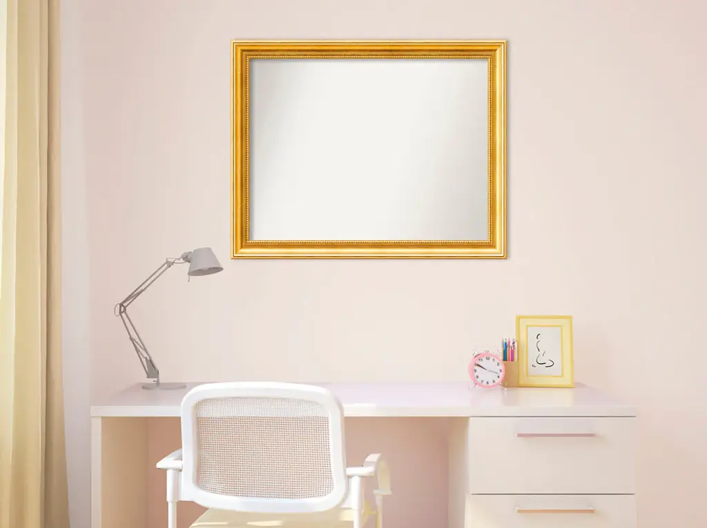 This mirror features a mottled gold colored frame with random black dotting throughout. It is enhanced with a tan patina along the beaded inner edge.Features:• Wall mirror frame is made of solid wood molding• Mirror features premium non beveled glass for a clear, undistorted image• Finished mirror is professionally handcrafted in Madison, Wisconsin• Ready to hang vertically or horizontally for easy installation• Custom packaged for safe transport and deliveryDetails:• Title: Wall Mirror, Choose Your Custom Size Medium, Townhouse Gold Wood• Product type: Framed mirror• Format: Horizontal/Vertical• Size: Medium• Frame: Gold with Beading 2-inch Wood• Image dimensions: 20.00 inches high x 26.00 inches wide• Outside dimensions: 23.38 inches high x 29.38 inches wide x 1.281 inches deepThis framed art print is being custom built for you. Please allow 10 business days for the product to leave our warehouse.