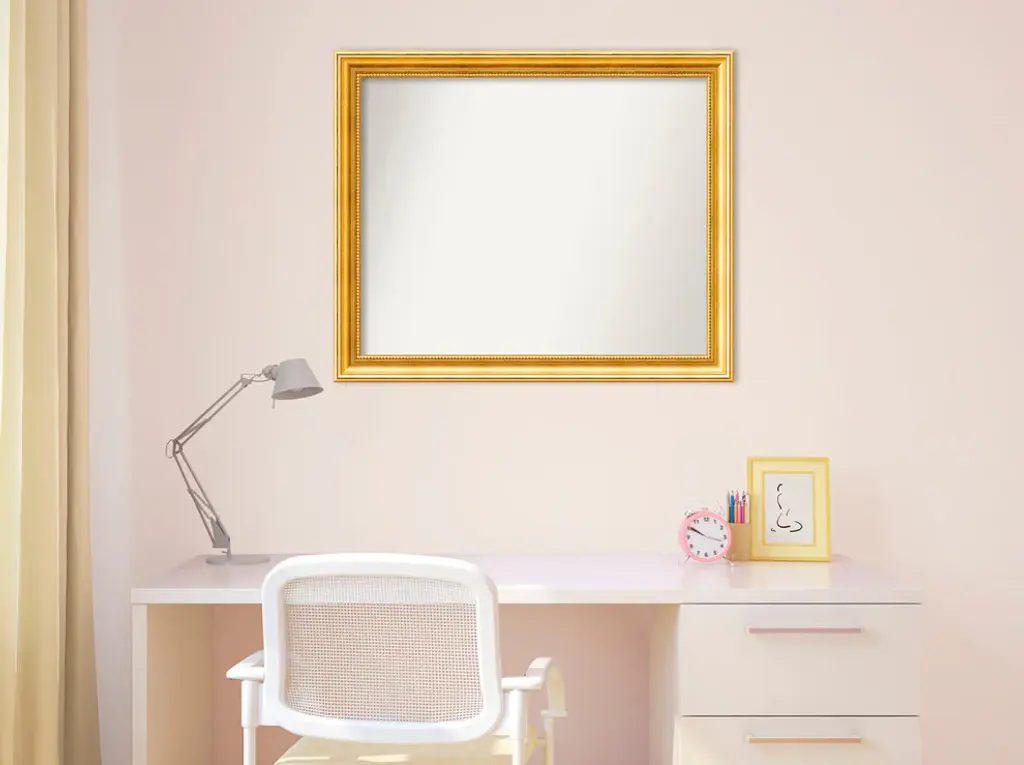 This mirror features a mottled gold colored frame with random black dotting throughout. It is enhanced with a tan patina along the beaded inner edge.Features:• Wall mirror frame is made of solid wood molding• Mirror features premium non beveled glass for a clear, undistorted image• Finished mirror is professionally handcrafted in Madison, Wisconsin• Ready to hang vertically or horizontally for easy installation• Custom packaged for safe transport and deliveryDetails:• Title: Wall Mirror, Choose Your Custom Size Medium, Townhouse Gold Wood• Product type: Framed mirror• Format: Horizontal/Vertical• Size: Medium• Frame: Gold with Beading 2-inch Wood• Image dimensions: 21.00 inches high x 26.00 inches wide• Outside dimensions: 24.38 inches high x 29.38 inches wide x 1.281 inches deepThis framed art print is being custom built for you. Please allow 10 business days for the product to leave our warehouse.