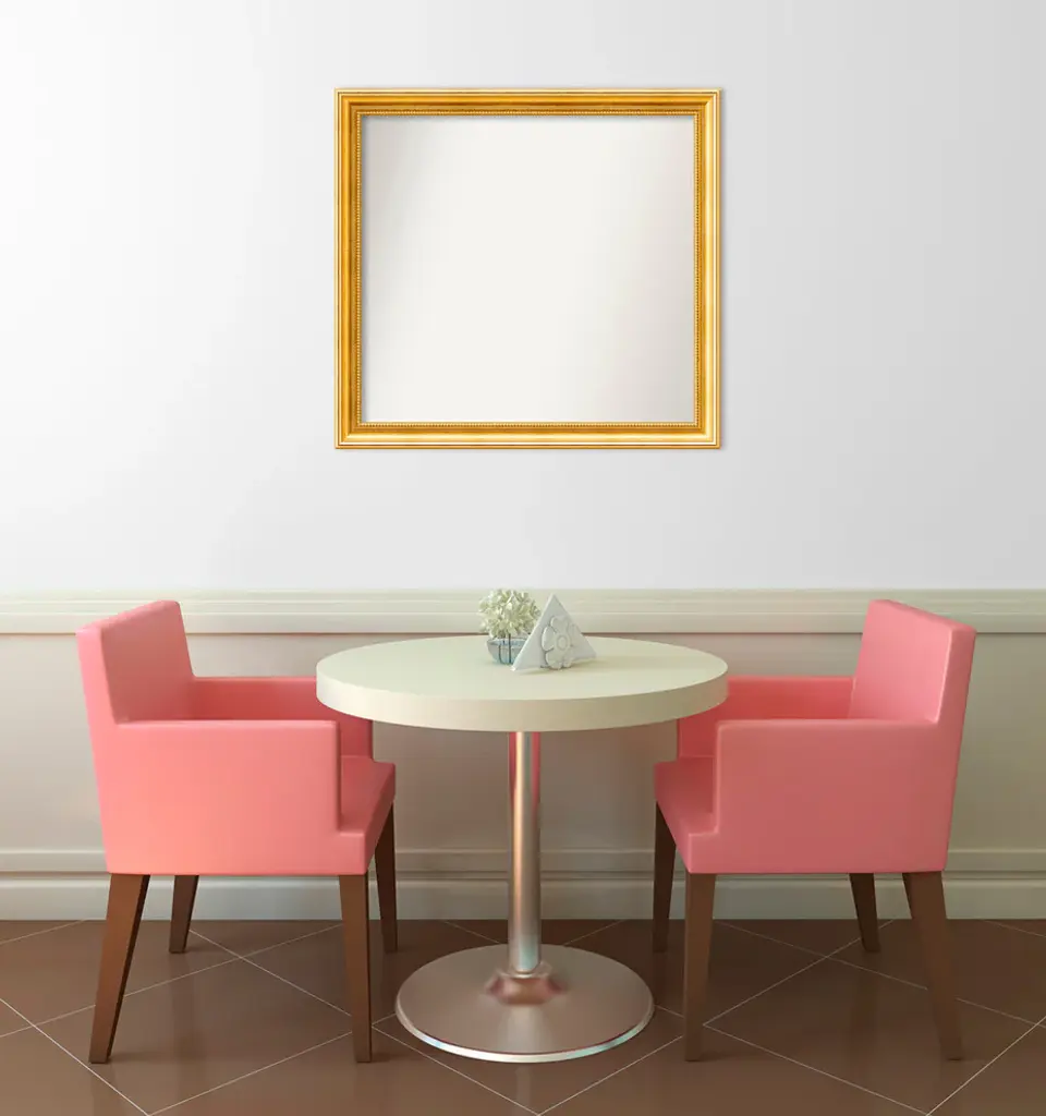 This mirror features a mottled gold colored frame with random black dotting throughout. It is enhanced with a tan patina along the beaded inner edge.Features:• Wall mirror frame is made of solid wood molding• Mirror features premium non beveled glass for a clear, undistorted image• Finished mirror is professionally handcrafted in Madison, Wisconsin• Ready to hang vertically or horizontally for easy installation• Custom packaged for safe transport and deliveryDetails:• Title: Wall Mirror, Choose Your Custom Size Medium, Townhouse Gold Wood• Product type: Framed mirror• Format: Horizontal/Vertical• Size: Medium• Frame: Gold with Beading 2-inch Wood• Image dimensions: 24.00 inches high x 26.00 inches wide• Outside dimensions: 27.38 inches high x 29.38 inches wide x 1.281 inches deepThis framed art print is being custom built for you. Please allow 10 business days for the product to leave our warehouse.