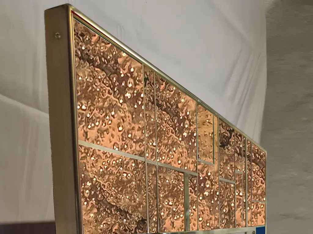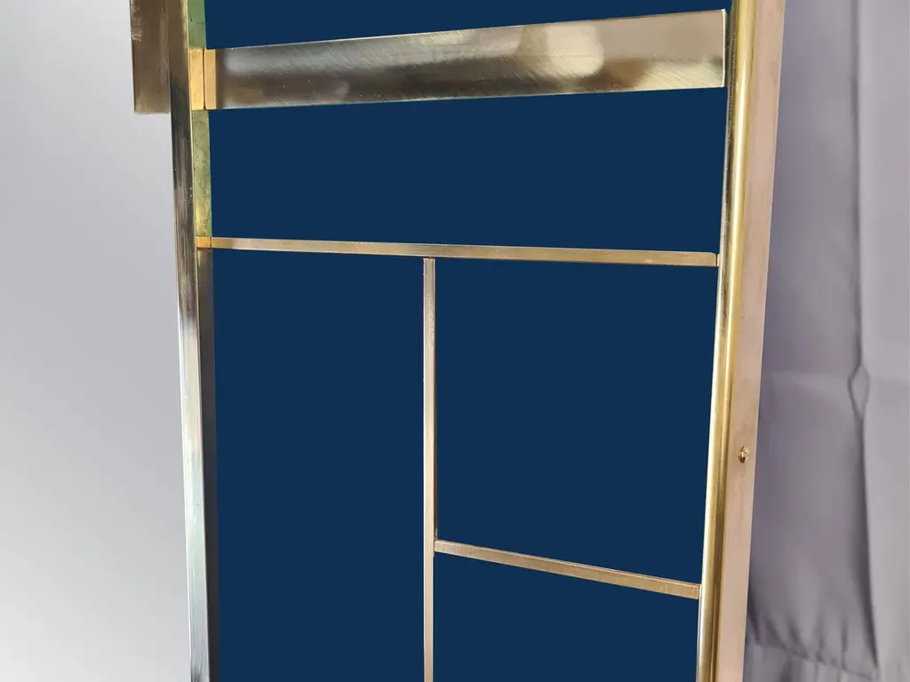 This refined wall mirror in dotted brass and blue Murano glass showcases the elegance of Italian design. Made of solid birch wood, the rectangular frame is adorned with intricate L-dotted brass accents that highlight its modern aesthetic. Gorgeous blue Murano glass adds a touch of color and sophistication, making it a striking focal point in any room.Handcrafted using traditional techniques, this mirror features meticulous handwork and soldering to ensure the uniqueness of each piece. This mirror is not only a functional object, but a work of art that enhances your decor.Elevate your space with this eye-catching wall mirror that perfectly blends craftsmanship and style. For more information on this beautiful piece, please inquire today.