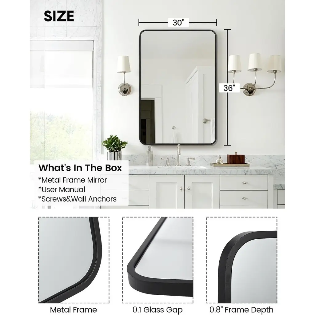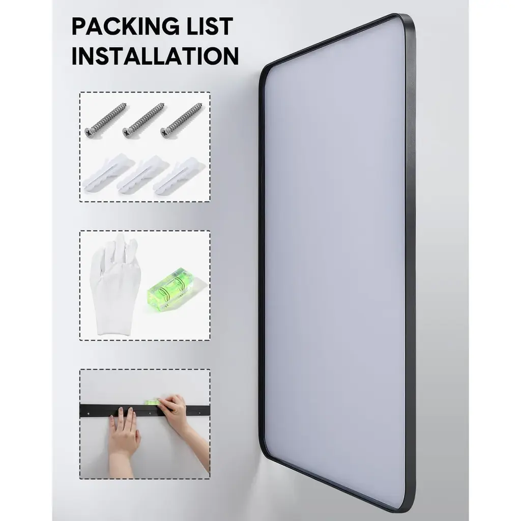 Tailor-made Fit: offers mirrors in four bespoke sizes (24x36, 40x30, or 48x30 inches) designed to flawlessly align with your space's dimensions. Crystal-Clear Reflection: Featuring superior 5mm polished glass with sterling silver backing, the mirror offers an unadulterated, distortion-free view, outshining typical 4mm mirrors in the market. Stylish Frame: The seamlessly welded matte black metal frame made of aluminum alloy brings robustness and dust resistance. Easy and Fast Installation: Value your time with our easy-install bathroom mirror, featuring hanging strips for quick setup. Guaranteed Safety and Satisfaction: Along with an explosion-proof membrane for additional safety, our mirrors come in drop-tested Styrofoam packaging.
