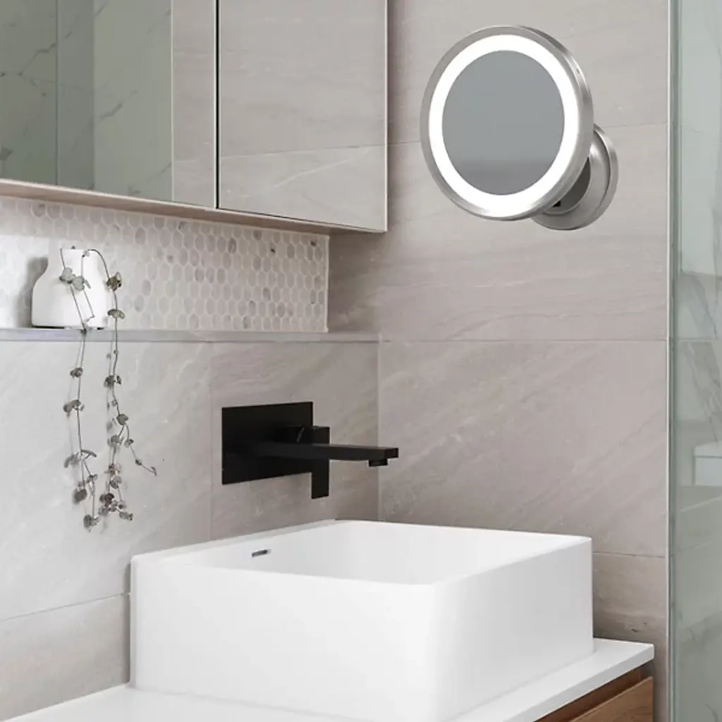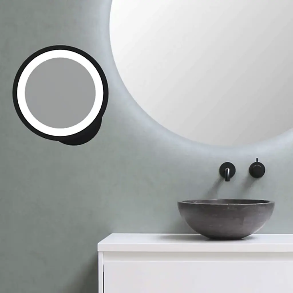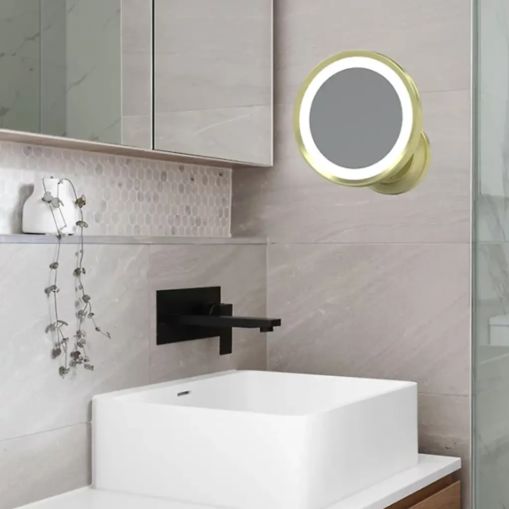 The Wall Mounted Single-Sided Round LED Mirror combines sophisticated functionality with modern design sensibility. This versatile fixture offers complete customization with 360-degree rotation at both the elbow and mirror, plus adjustable LED lighting that transitions between warm (3500K) and cool white (5500K) illumination. Crafted from metal and glass, this hardwired sconce includes all mounting hardware for easy installation. Its contemporary design and ample flexibility make it an inspired option for any vanity space.