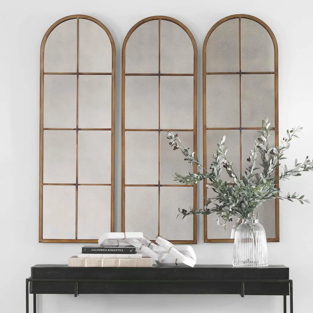 This arch features a forged iron frame in a hand applied warm bronze finish with burnished distressing encasing an antique style mirror. Sold individually. Shown are three pieces of #13463.