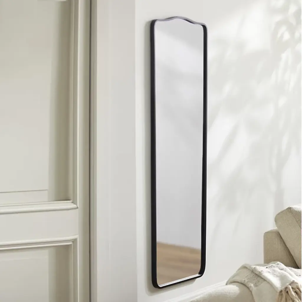 The artisanal modern style of the Waterford Full Length Mirror from Surya commands its surroundings with a mix of iron and high-quality mirror glass. The vertical-mount mirror features sleek rounded corners and a gracefully curving upper edge that frames the reflector and enhances and expands the feel of any room in which it is placed.