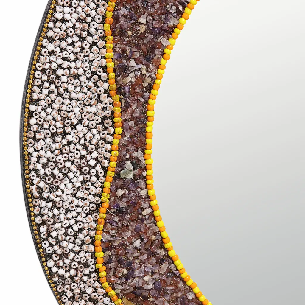 Forming vibrant waves, agate gemstones are arranged around the frame of this round mirror, accented with petite glass beads. Khalid Ali presents a stunning wall mirror that is crafted from wood by Indian artisans.