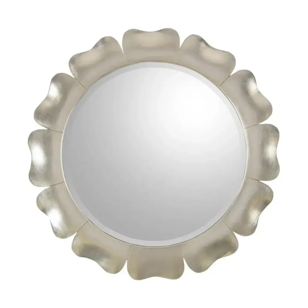 The Wavelength Mirror is a gorgeous blend of pristine metallic tones and unpredictable curvature. Crafted from beech wood, the mirror showcases a unique silhouette that evokes the ebb and flow of sound waves. The border displays a stunning Exotic Gold finish, which is tastefully contrasted by a matching pattern in Transitional Silver. Two tiers of beveled glass separated by these staggered patterns communicate a wealth of depth and dimension to an interior space. This mirror is affixed with steel hangers.