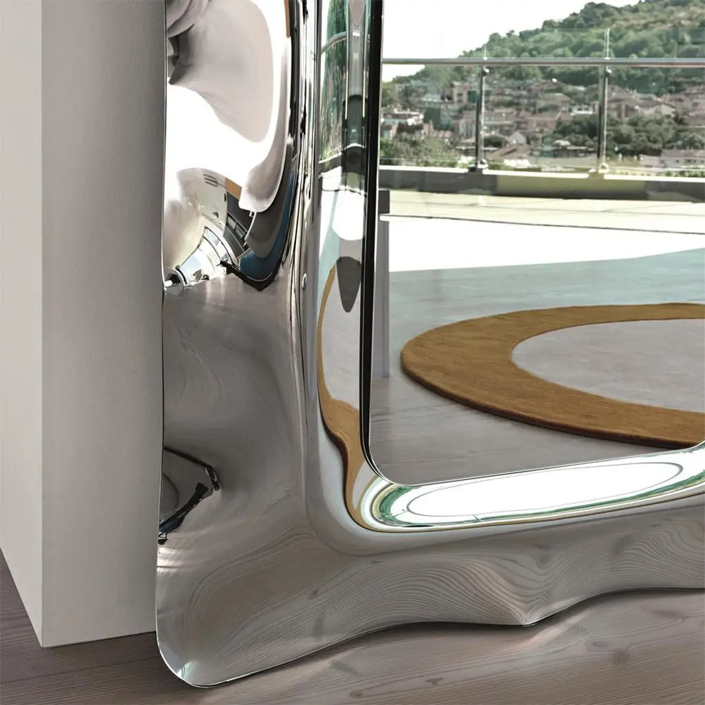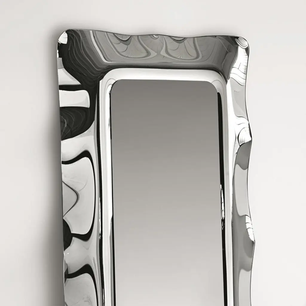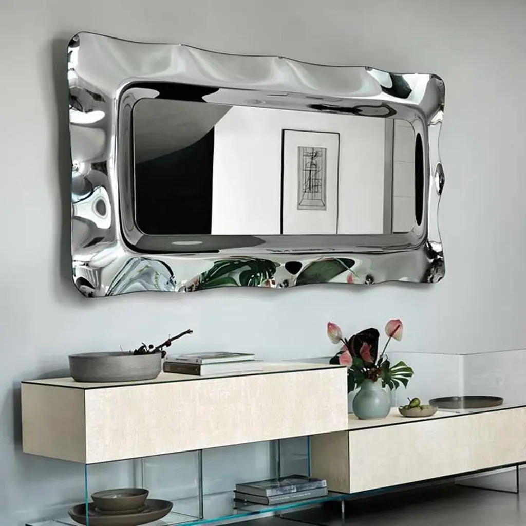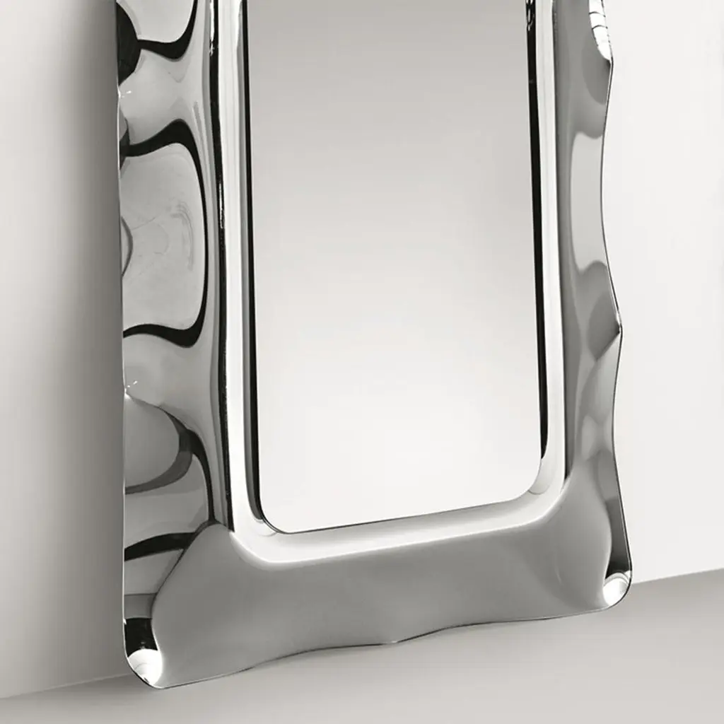 Mirror wavy rectangular in high temperature fused mirror glass,6mm thickness. With painted polished metal frame and withsilvered back.