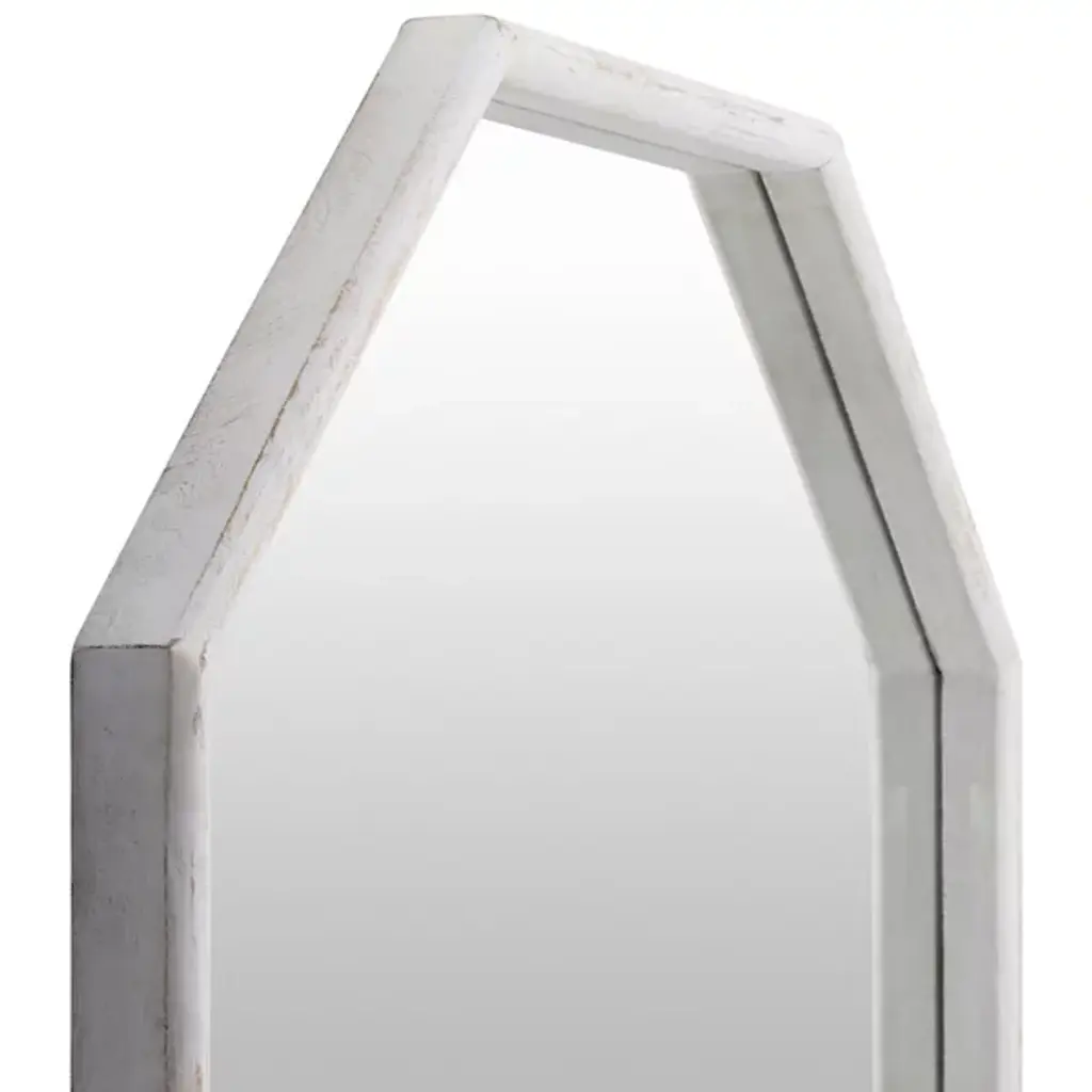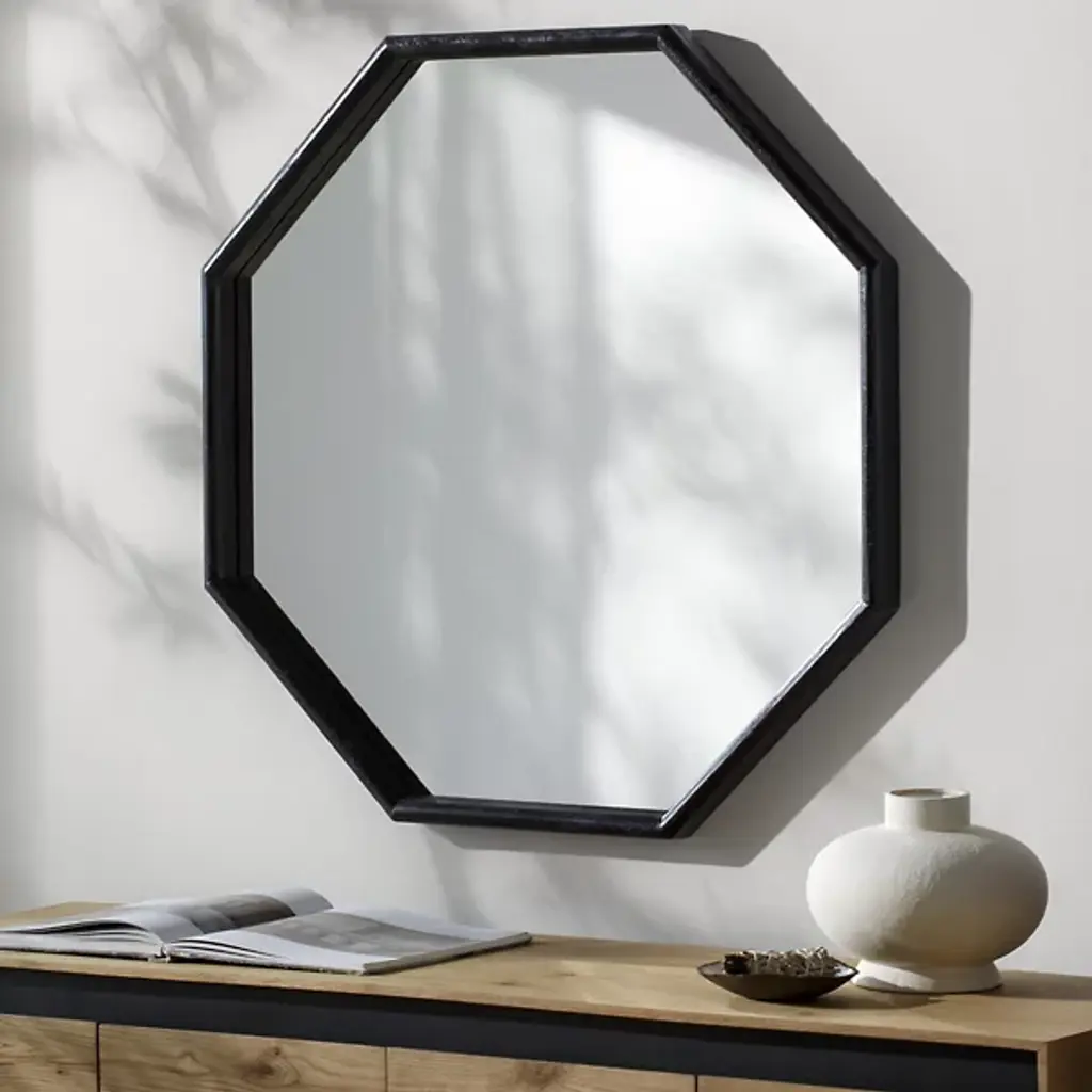 The Weipa Mirror from Surya blends artisanal modern style with practical design. An octagonal mirror made in India with a durable mango wood frame, this vertical-mount mirror features a geometric design, contrasting its clean-surfaced central reflector with the natural woodgrain of the frame. The thin wood elements offer a delightful enhancement, softening the angular corners of the reflector.