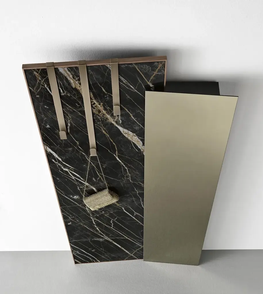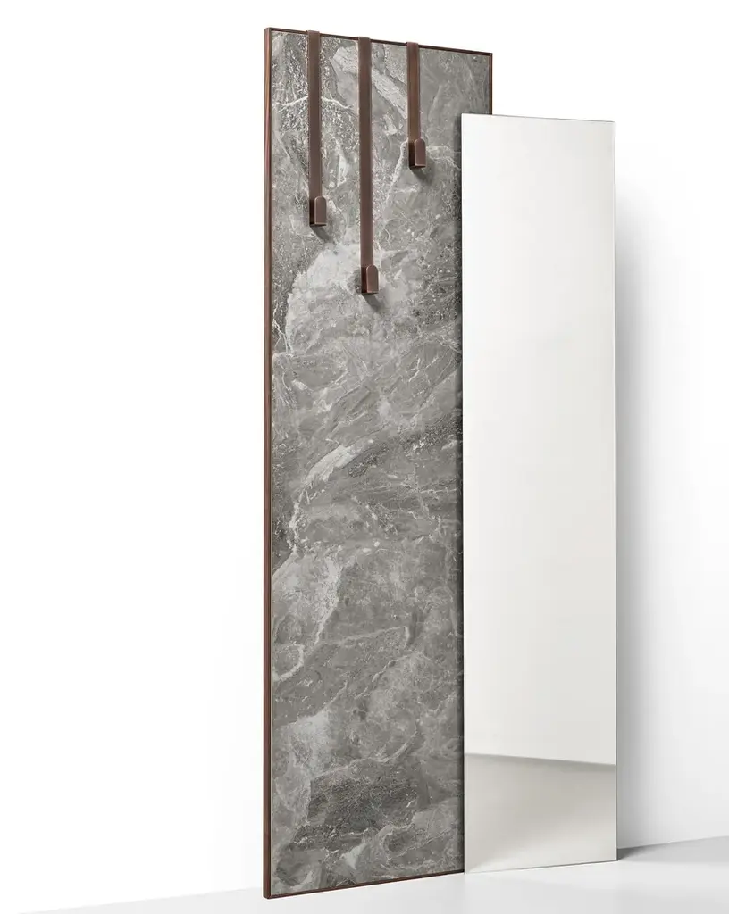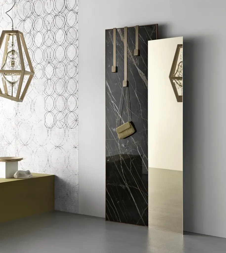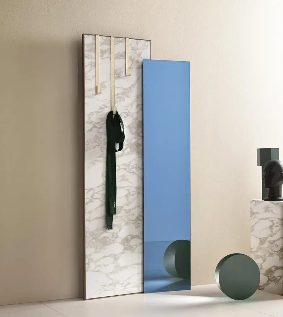 Welcome springs from the combination of a strong material like marble and the absolute elegance of glass. It is a wall mirror composed of two sheets, sloping towards the inside: one of them has a marble effect, bordered by a frame in solid Canaletto walnut; the other is a mirror, in transparent, blue or bronze finish. The structure can be completed with metal coat racks to attach to the marble panel, which can have three different finishes: brushed bronze, brushed copper or brushed gold.