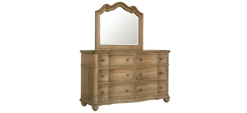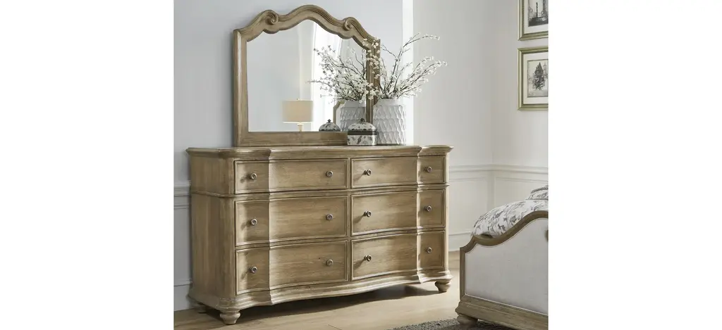 Weston Hills Mirror bring the essence of an elegant home in the French countryside to your bedroom. This beveled mirror features a shaped wood frame with wood trim that displays intricately detailed scrollwork. White cerusing on cathedral hickory veneers enhances the grain and adds softness to the warm tones of the wood. Shapley fronts, rounded corners, and walnut inlays add distinction and character. Weston Hills --perfectly timeless, perfectly today, perfectly you.